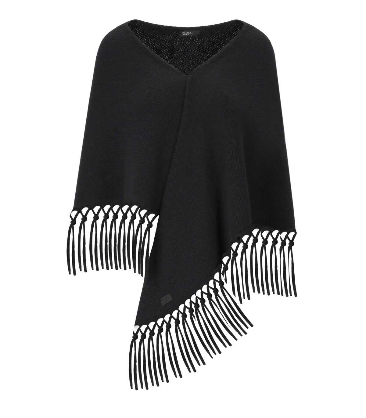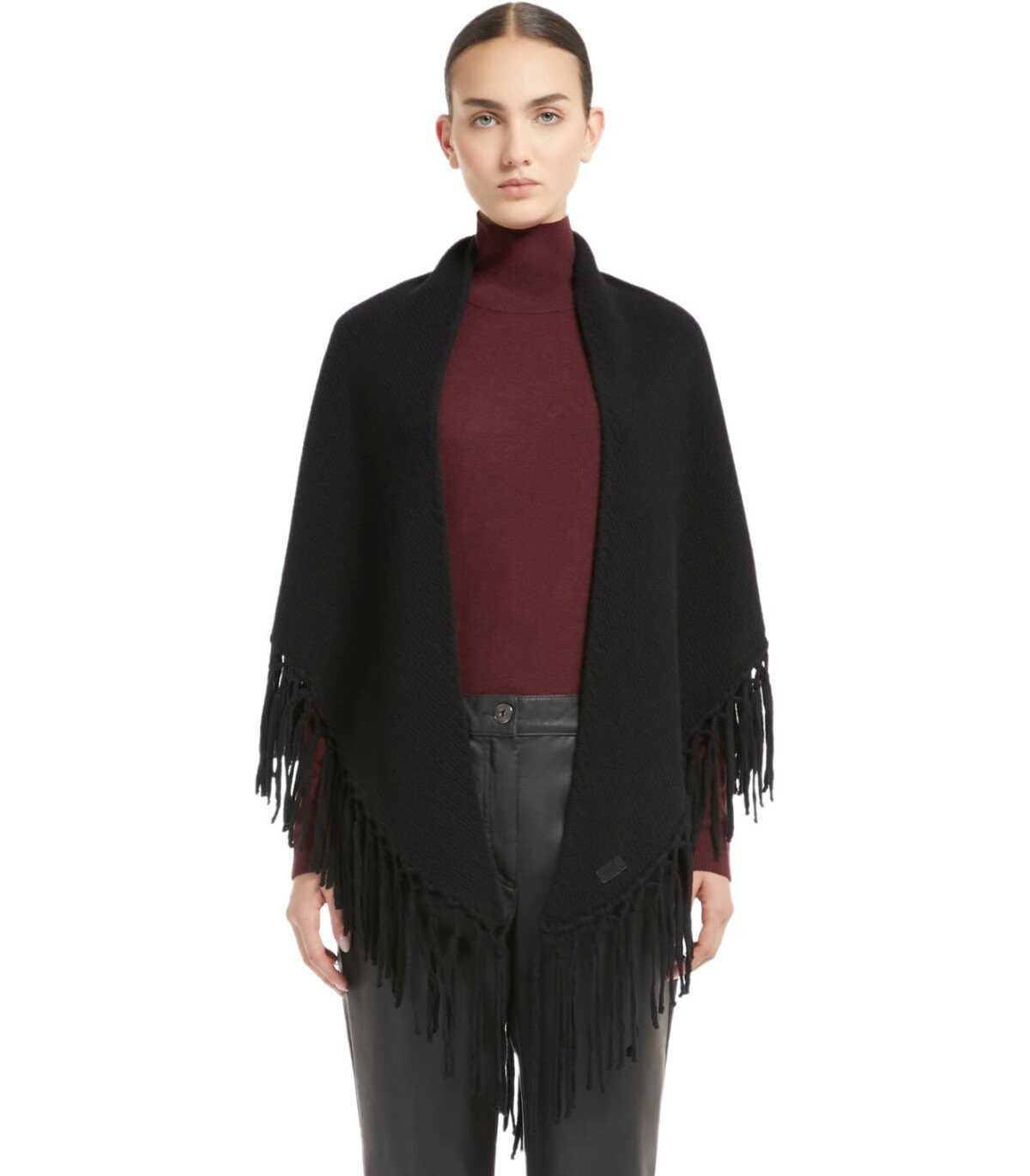 Max Mara Weekend Tornado cape made of pure wool yarn in black. Characterized by a fringe pattern on both ends, it has a triangular shape. Adorned with a logo label embroidered in tone.