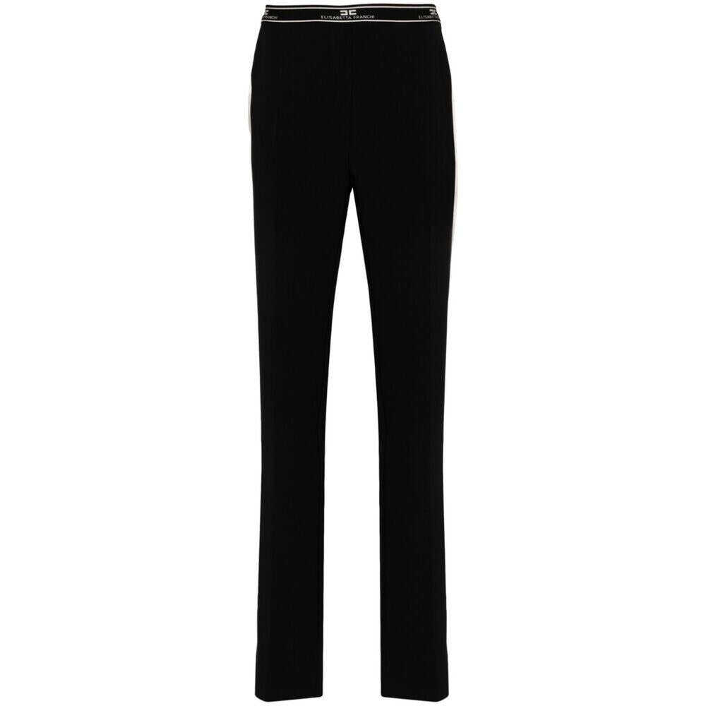 Black stretch-design crepe texture side stripe detailing straight leg side zip fastening elasticated logo waistband pressed crease two diagonal pockets to the sides rear jetted pocket split ankles