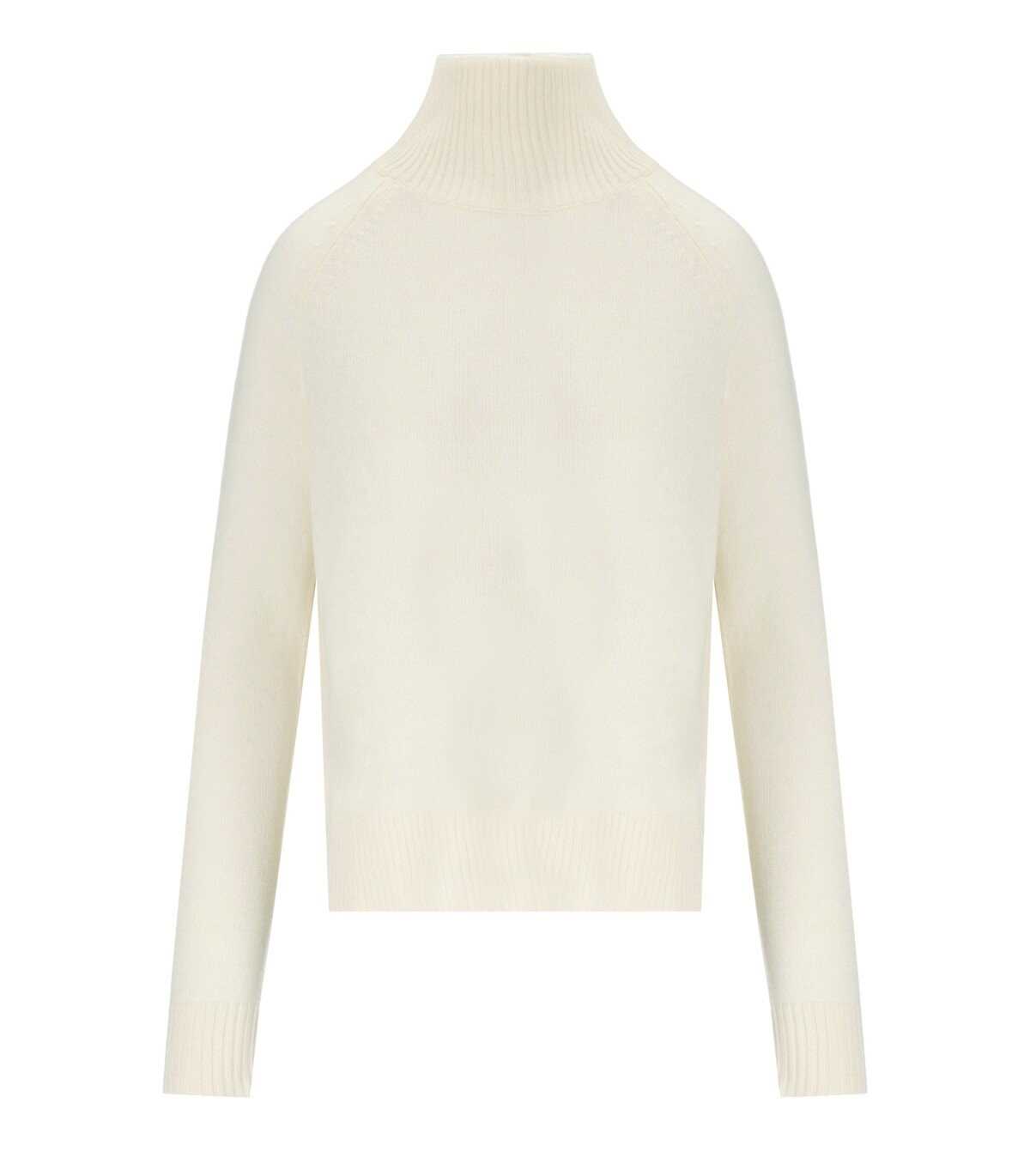 Max Mara Weekend Alcali turtleneck jumper made of precious pure cashmere yarn, in white color. Characterized by long raglan sleeves and side slits at the hips, it has a medium length. Tailored in satin stitch, it features a slightly asymmetrical hem at the back. Adorned with ribbed edges. Relaxed fit.
