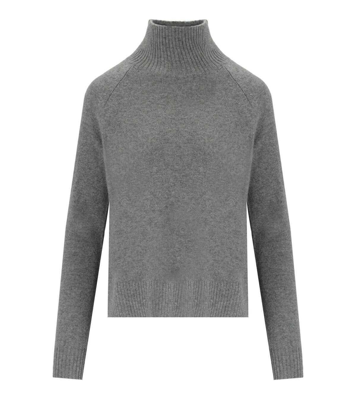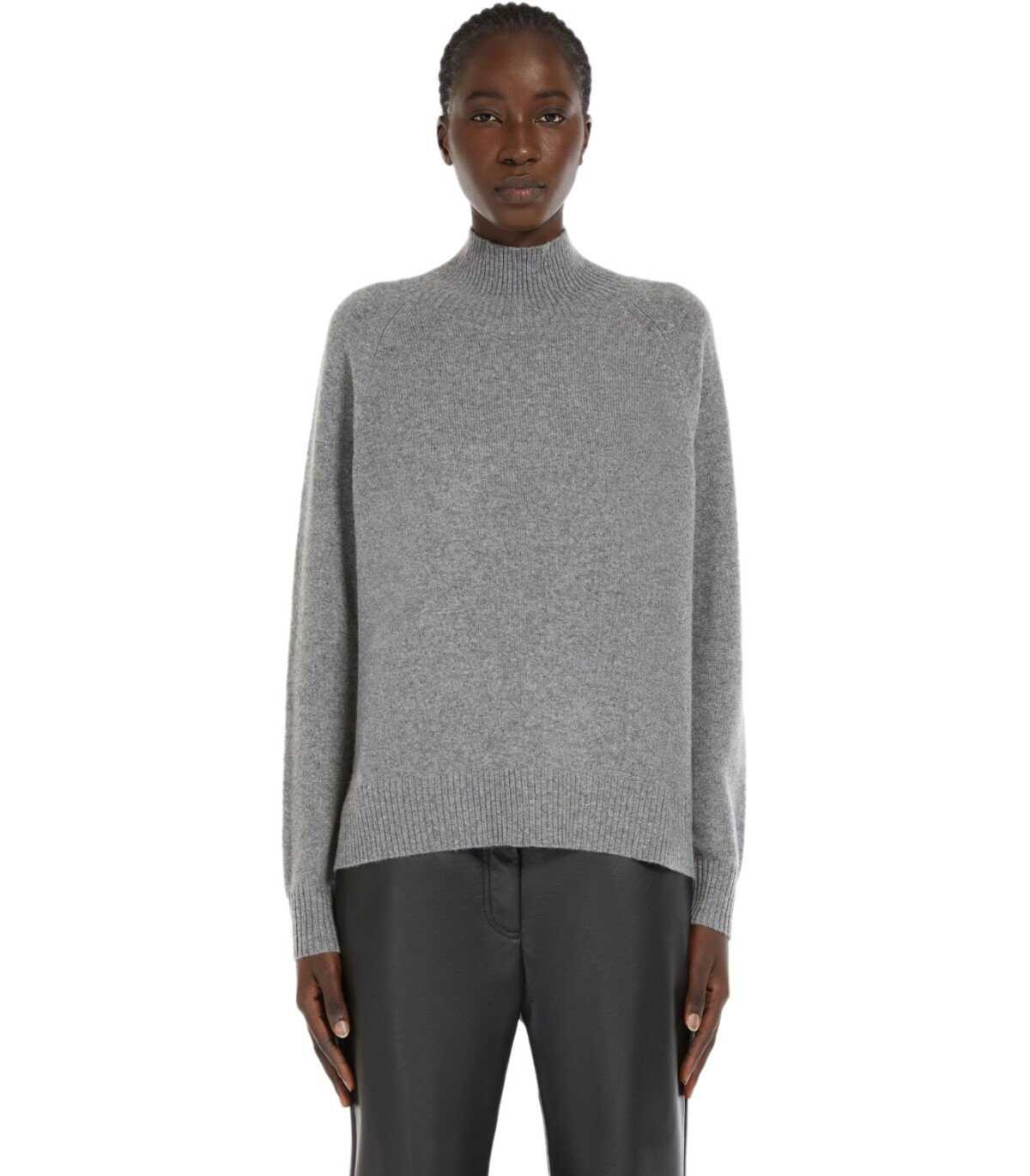 Max Mara Weekend Alcali turtleneck jumper, made from precious cashmere yarn worked in satin stitch, in gray color. Characterized by a medium length and finished with ribbed edges, it features long raglan sleeves with side slits at the hips. Asymmetrical hem slightly longer at the back. Loose fit.