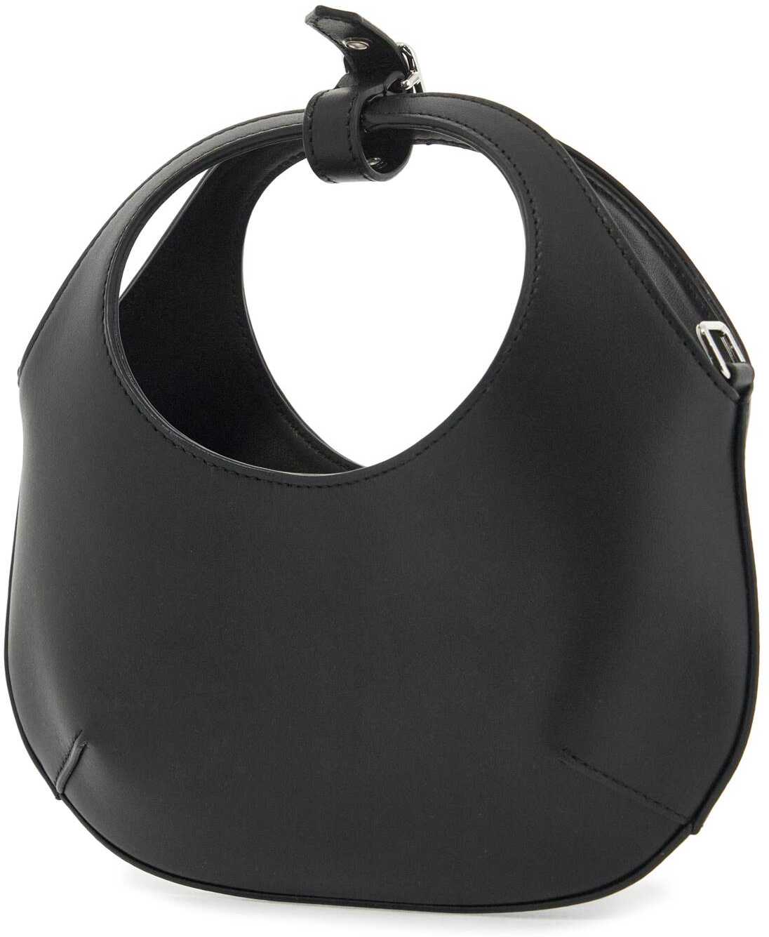 The mini Holy bag by Courrèges is made of smooth leather with a silver metal monogram. It features a snap closure, a removable decorative micro buckle on the handles, and a suede-like microfiber interior with a credit card slot. The adjustable and removable shoulder strap adds versatility to this stylish piece.