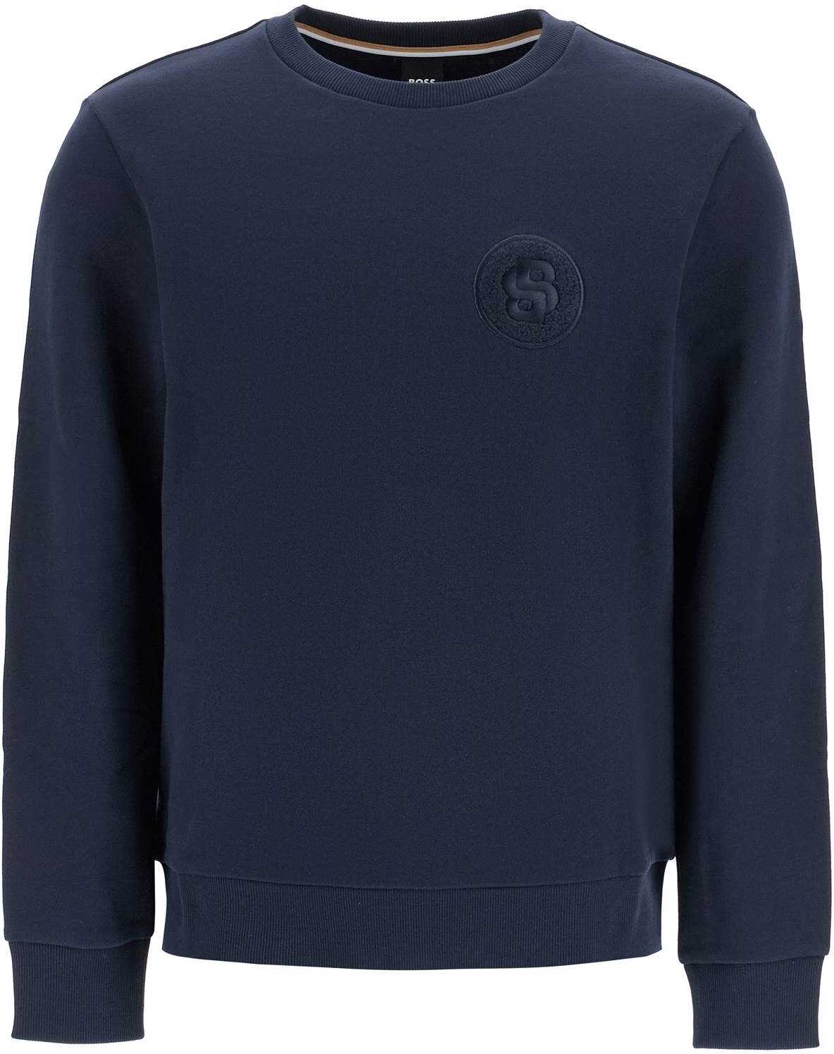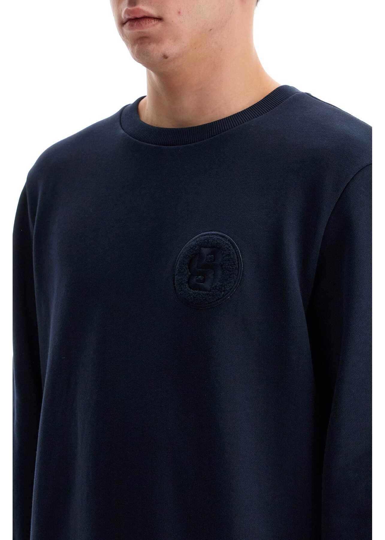 This BOSS crew neck sweatshirt is made of brushed cotton jersey and features tonal teddy patches with a double embroidered monogram. It has a regular fit and the model is 182 cm tall, wearing size M.