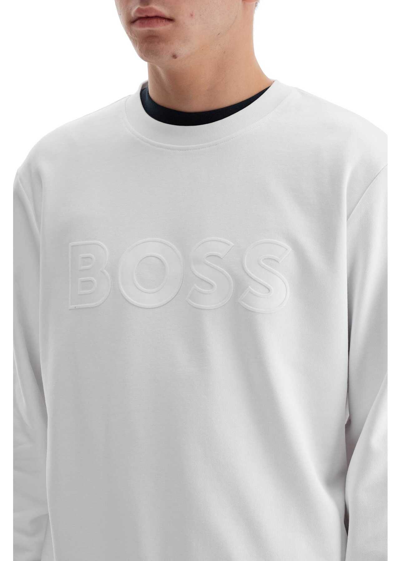This BOSS crew neck sweatshirt is made of loopback cotton jersey and decorated with a tone-on-tone logo patch featuring flocked edges. It has a regular fit and the model is 182 cm tall, wearing size M.