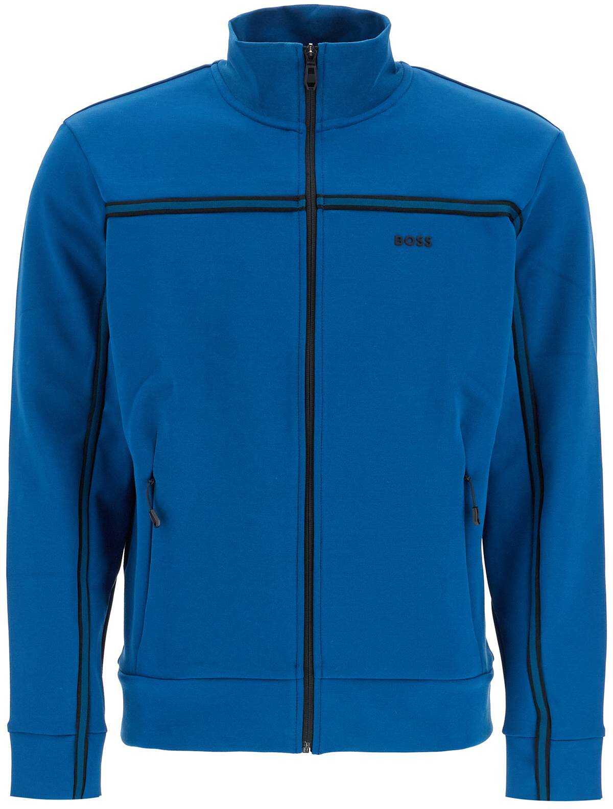 This BOSS high-neck sweatshirt is made of compact stretch cotton jersey, decorated with a knitted band on the square and sleeves and a rubberized logo on the chest. It features a zip closure, front pockets with invisible zipper, and a regular fit. The model is 182 cm tall and wears size M.