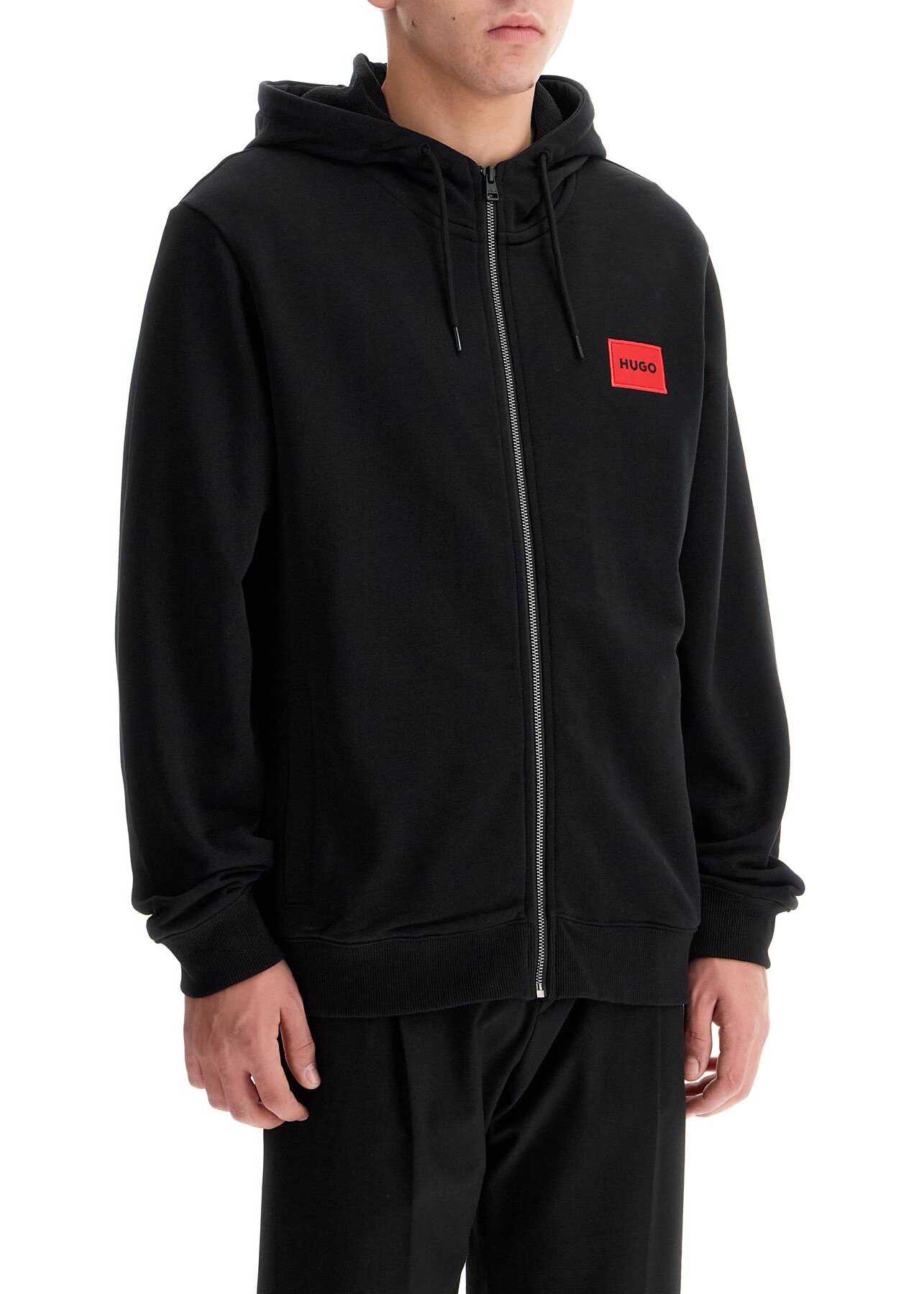 Hugo adjustable hooded sweatshirt in medium weight brushed cotton jersey with sewn logo label on the chest. Featuring a full zip closure and side pockets, it is finished with ribbed cuffs and hem. Regular fit. The model is 182 cm tall and wears size L.