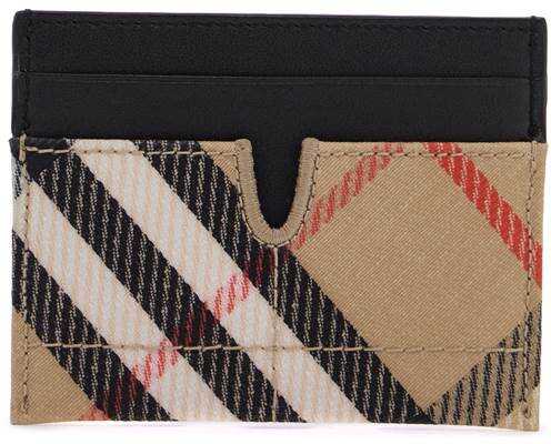 The Burberry Snip Check credit card holder is made of coated canvas with the iconic Burberry Check pattern and a leather interior. It features two slots on each side and a central compartment.