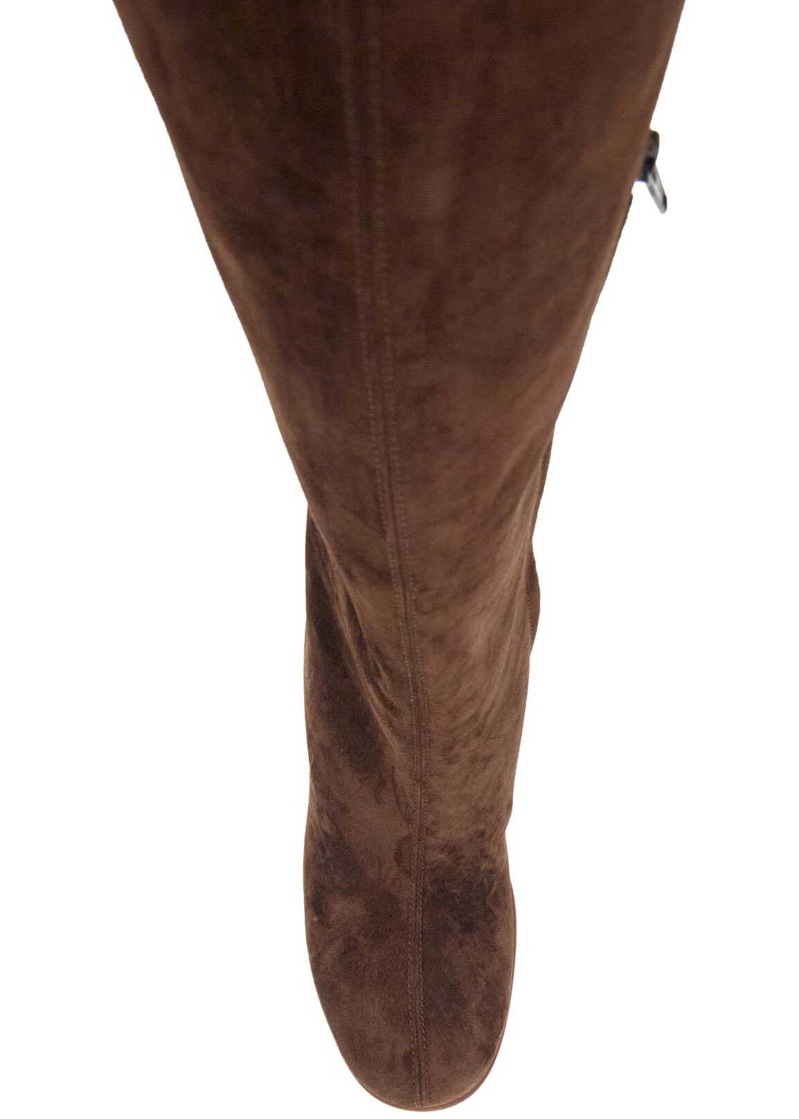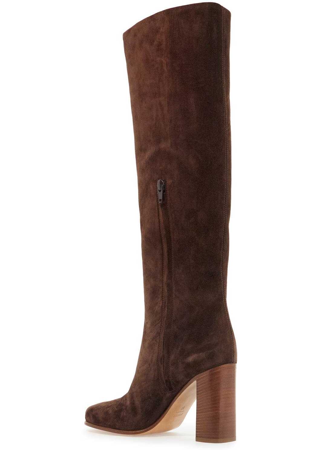 Khaite knee-high boots made of suede leather with a round toe, partial side zip closure, leather interior and leather sole.