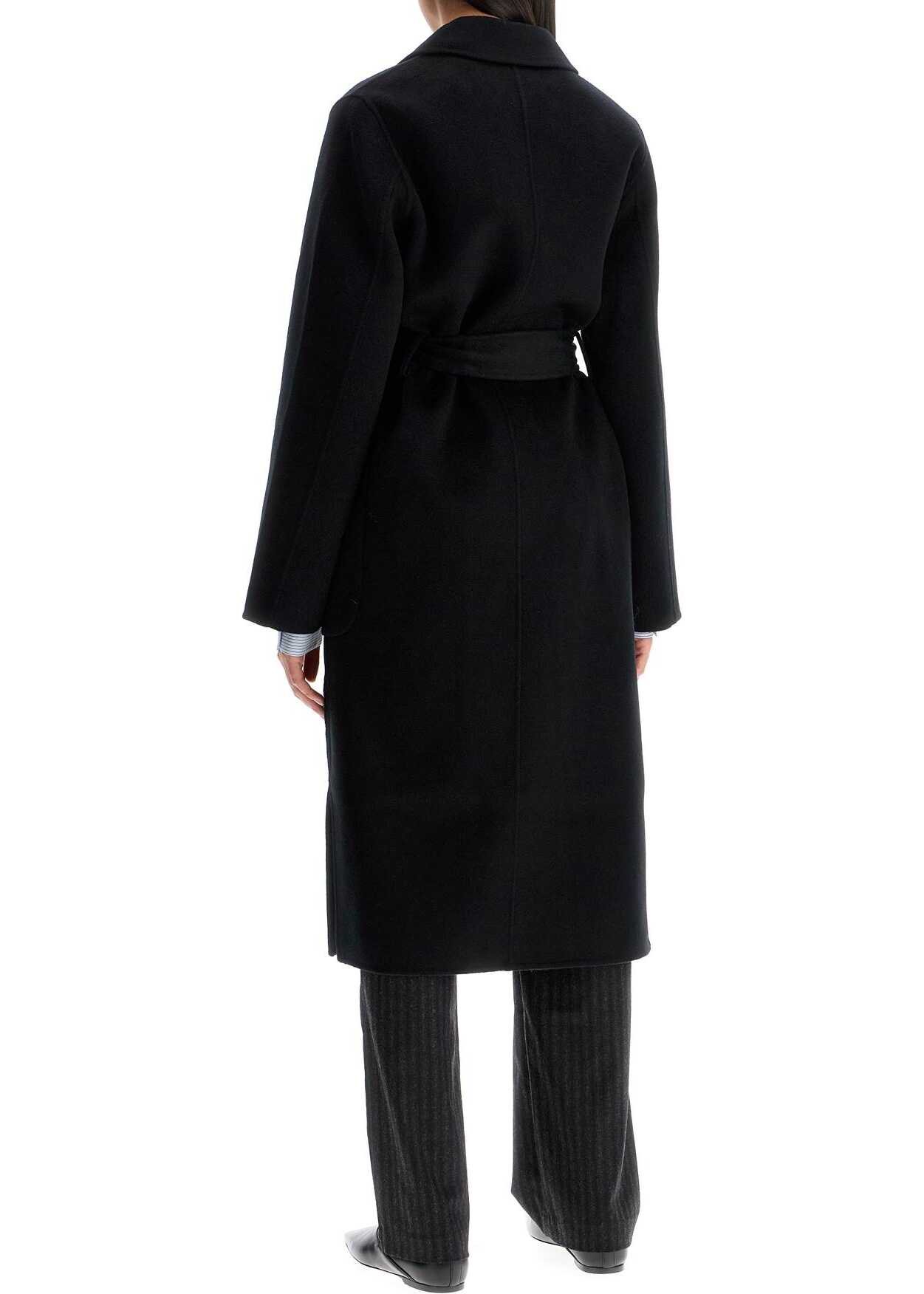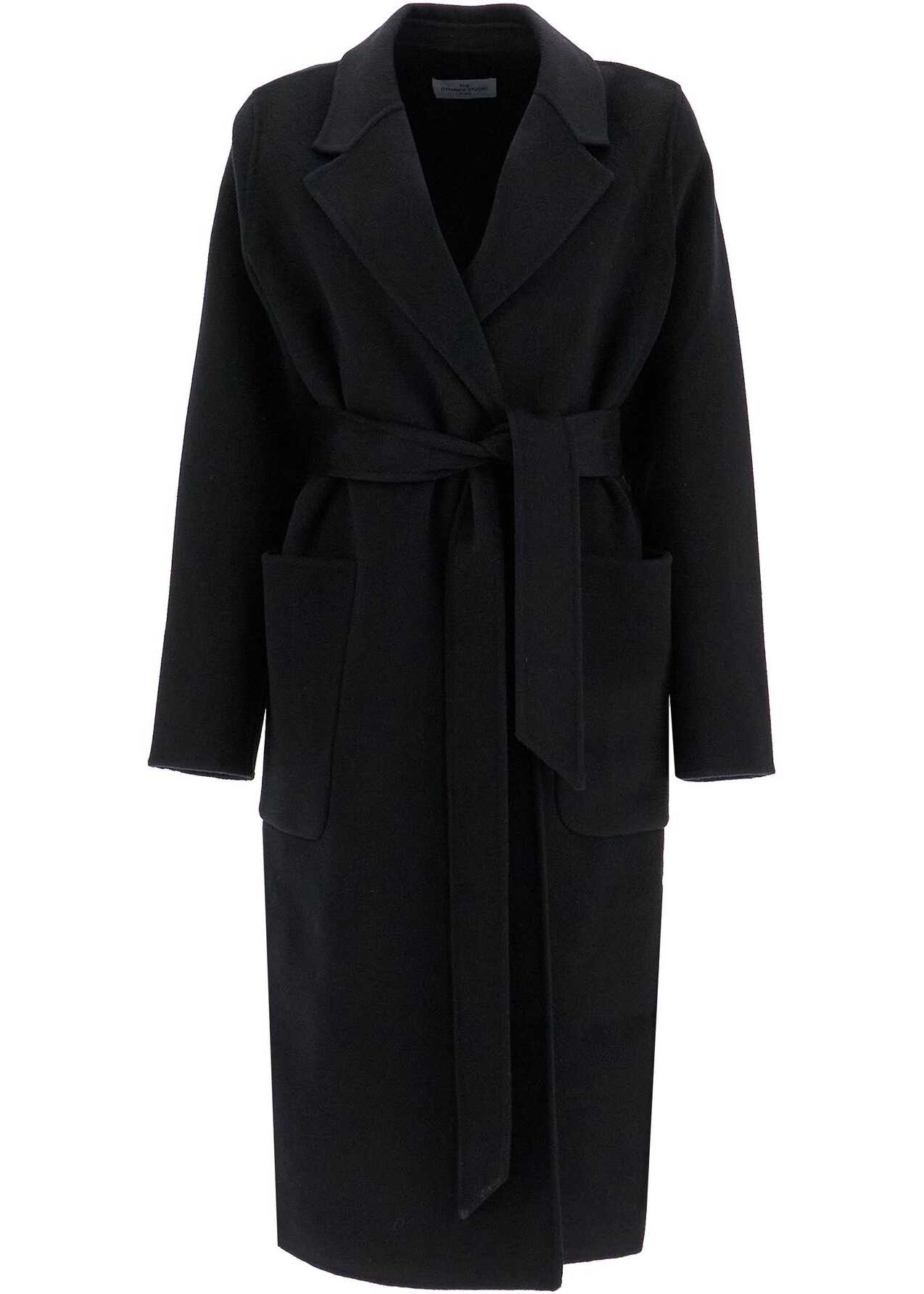 The Dynamis Studio's Milan coat is made of wool and features a robe-style design. It has peak lapels, large patch pockets, side slits, and a relaxed fit. The model is 177 cm tall and wears an IT size 38.