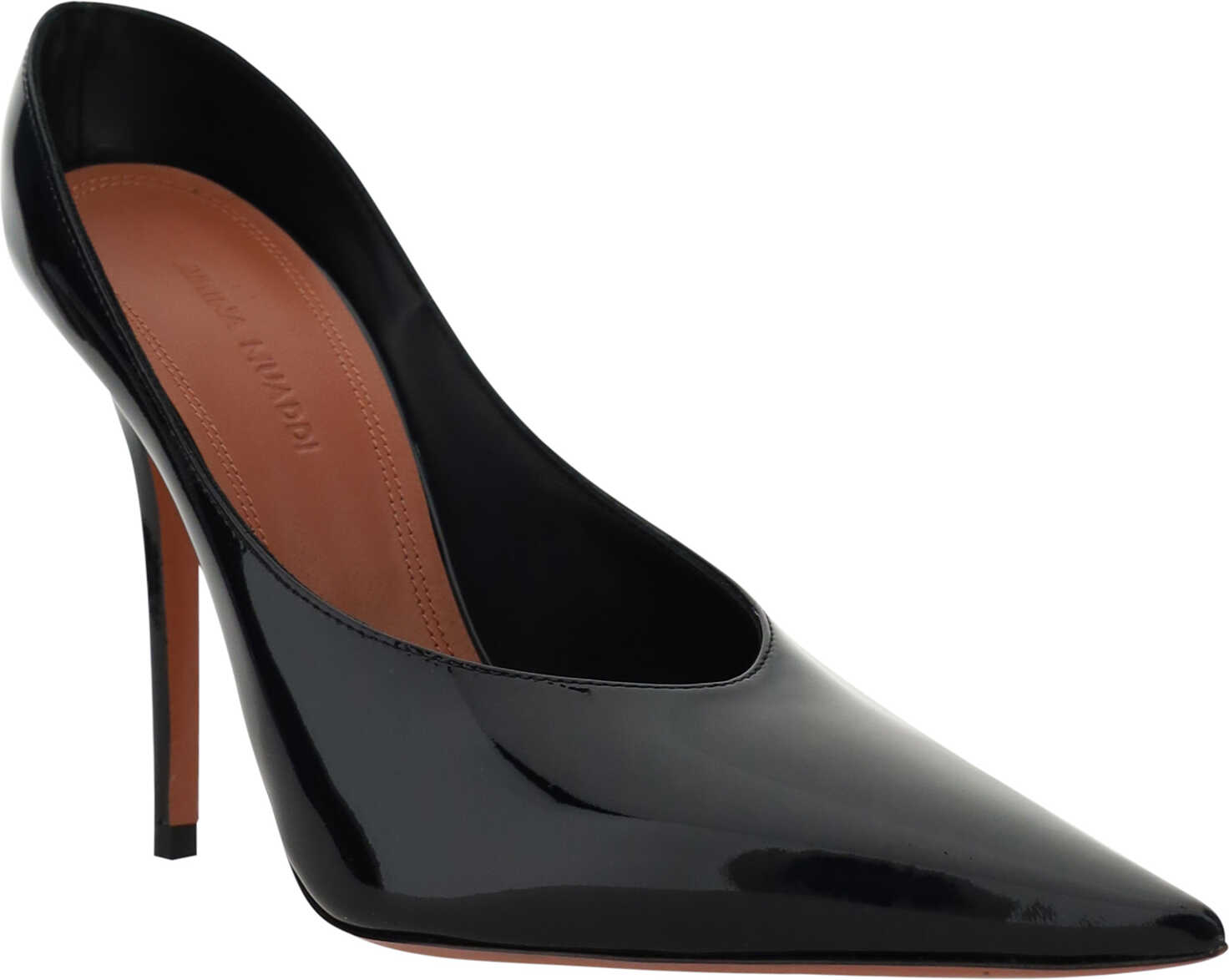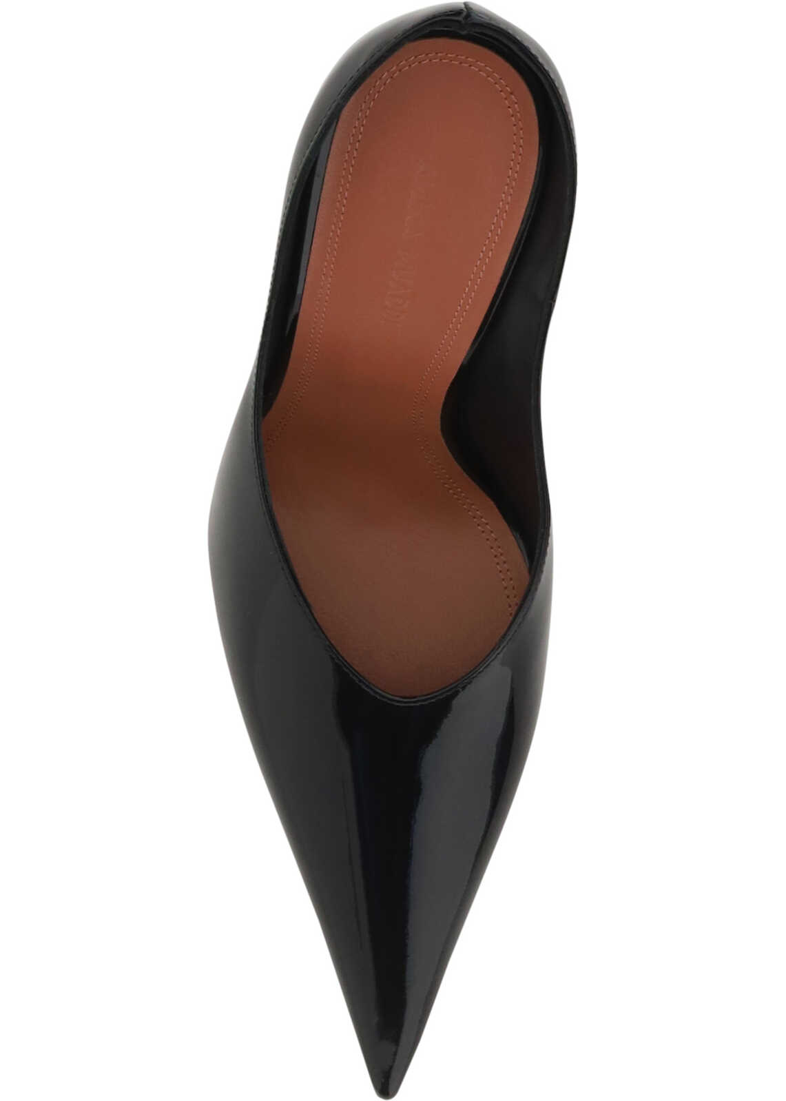 Leather Anok Pumps by Amina Muaddi, elongated toe, patent leather design, leather stiletto heel, contrasting logo insole.