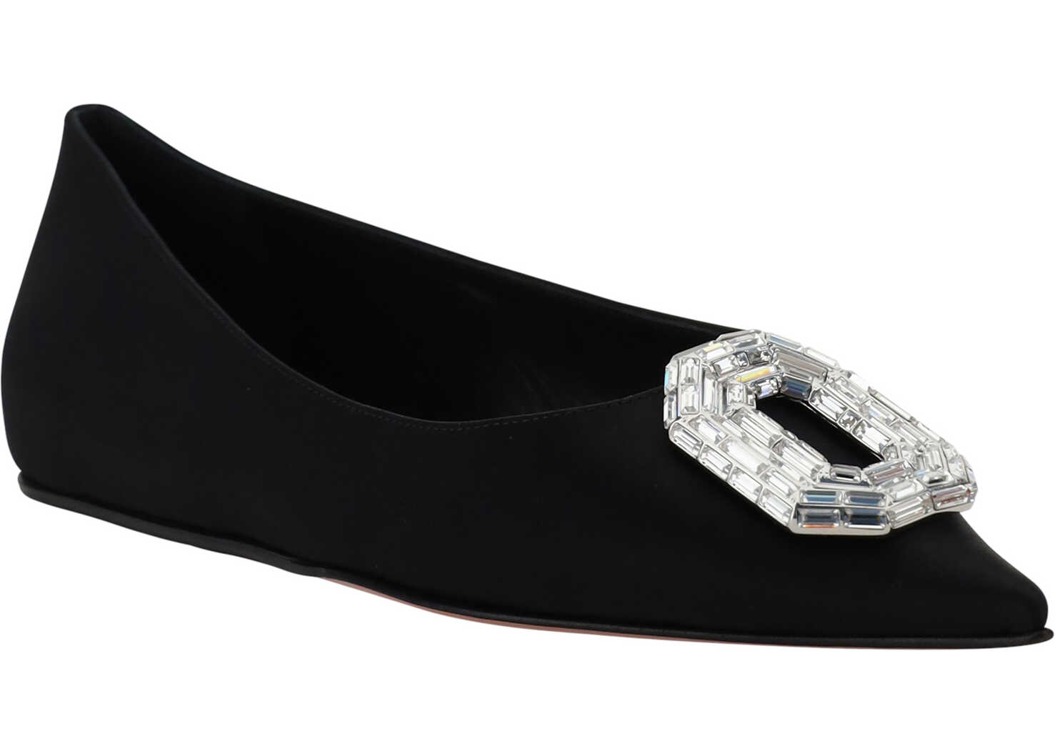 Silk Satin Camelia Ballerinas by Amina Muaddi, elongated toe on front, rhinestone and glitter jewel applied embossed on toe, flat sole, press-stamped logo leather insole.