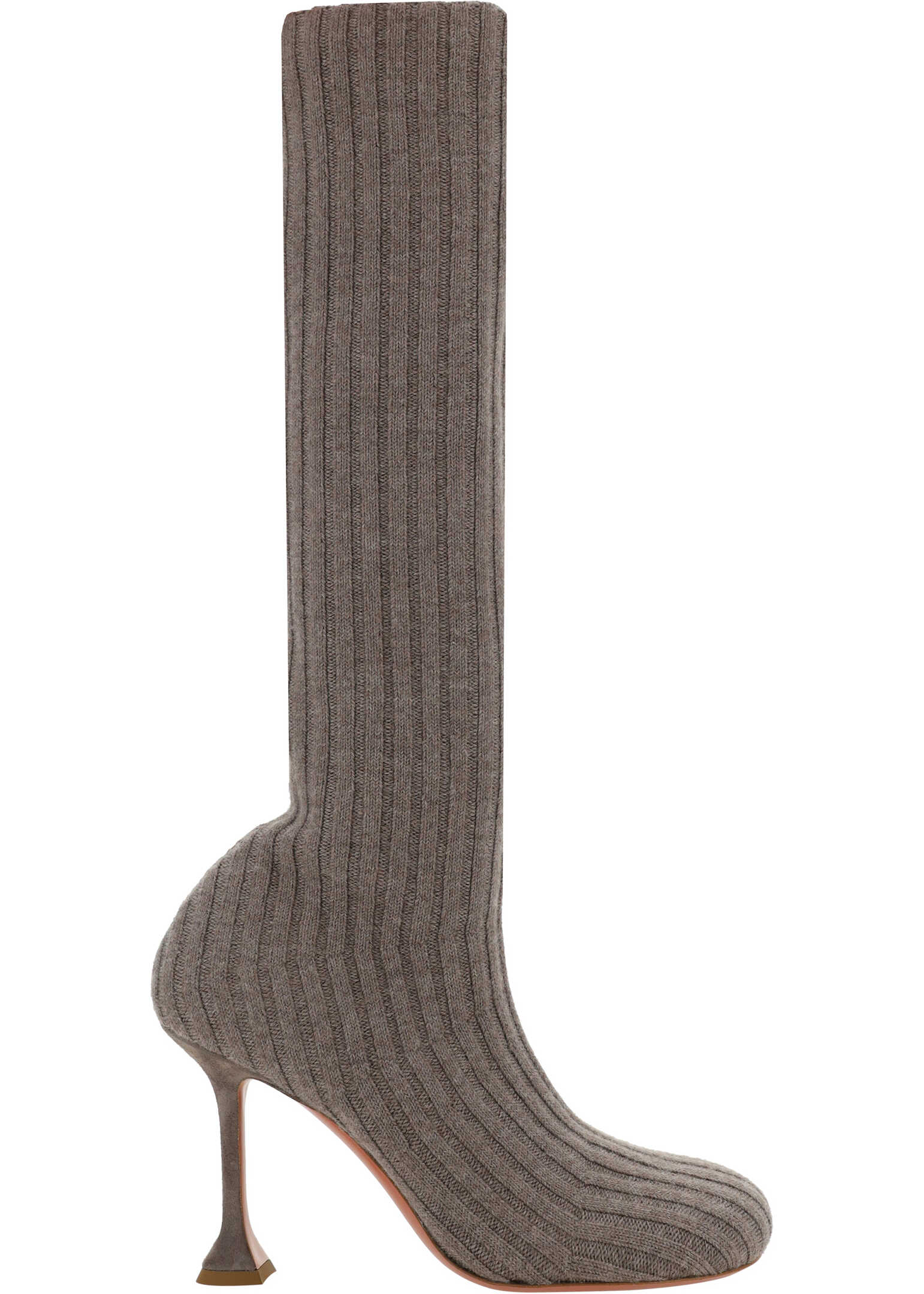 Veneda Boots by Amina Muaddi, ribbed sock effect design, slip-on style, round toe, geometric leather heel, close fit.