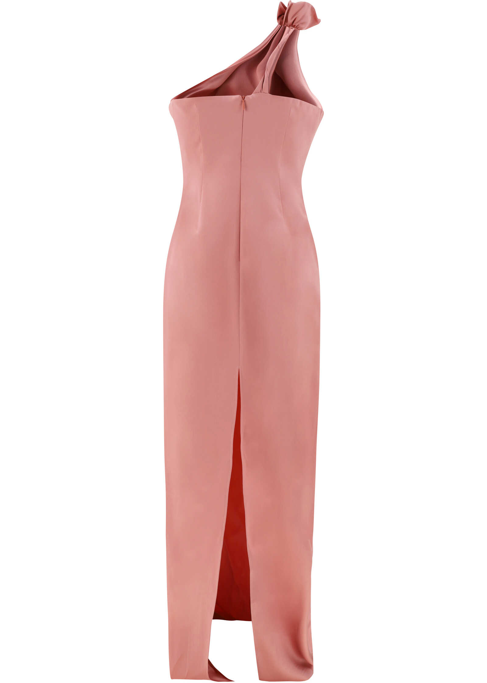 Silk Long Dress by Magda Butrym, one-shoulder design with the brand's iconic rose appliqué on twisted shoulder strap, back zipper closure, deep back slit, monochrome pattern, close-fitting fit.