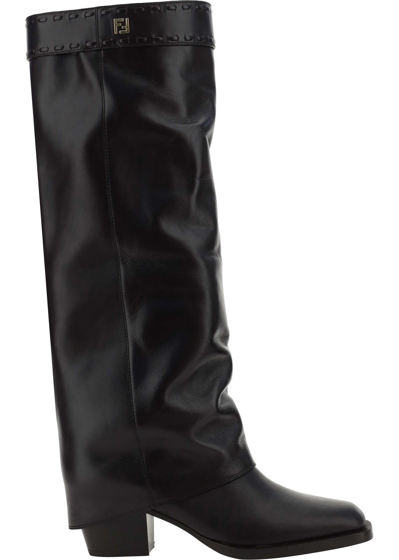 Leather Boots by Fendi, slip-on style, square toe, heel covered with tube leg that creates a trompe l'oeil effect, strap with the brand's iconic FF on the knee, leather chunky heel, contrasting logoed insole.