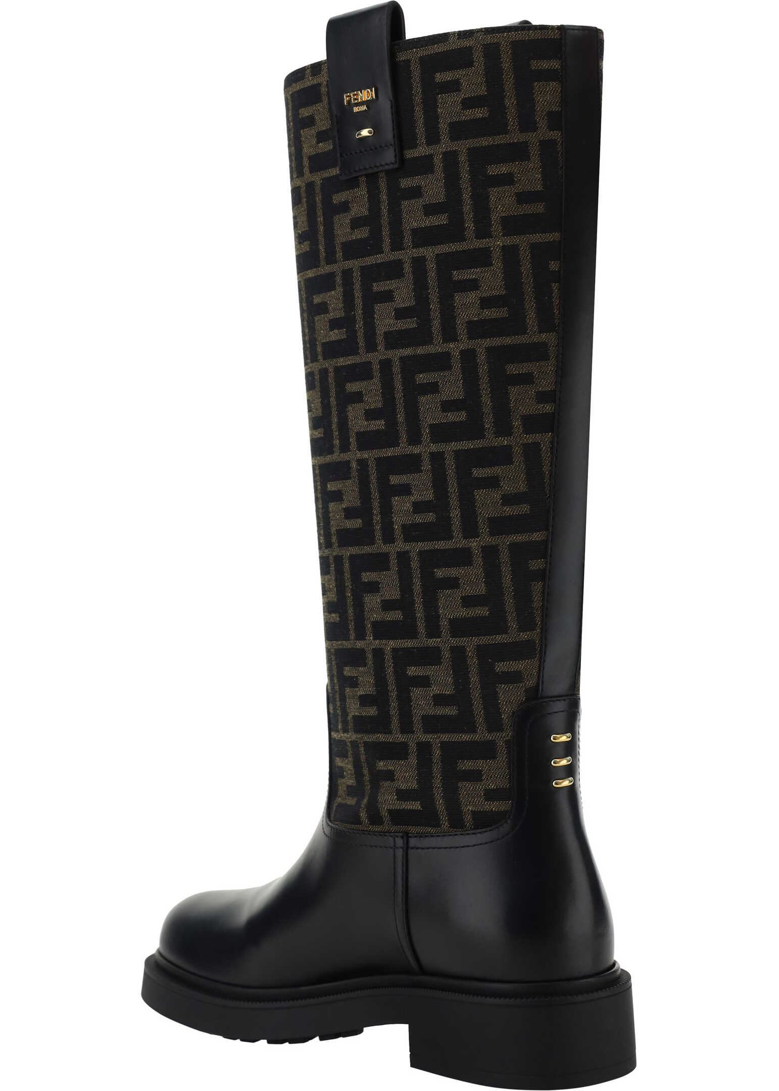 Fendi's Boots are distinguished by a round toe and leather details that add a touch of sophistication. The shaft is made of jacquard fabric with the iconic FF motif repeated all-over, a recognizable symbol of the maison. The rubber block heel ensures comfort and stability, while the three-dimensional brand monogram plaque applied on the back adds a distinctive and contemporary detail.