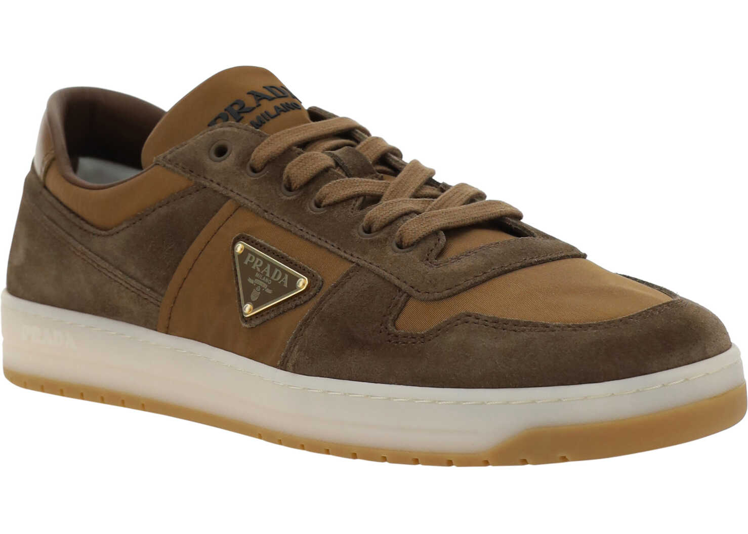 Calfskin Downtown Sneakers by Prada, panelled suede design, a lace-up front fastening, a round perforated toe, an iconic enameled triangular brand signature plaque applied to the outer side panel, a branded heel and front label, a flat sole, and a two-tone pattern.