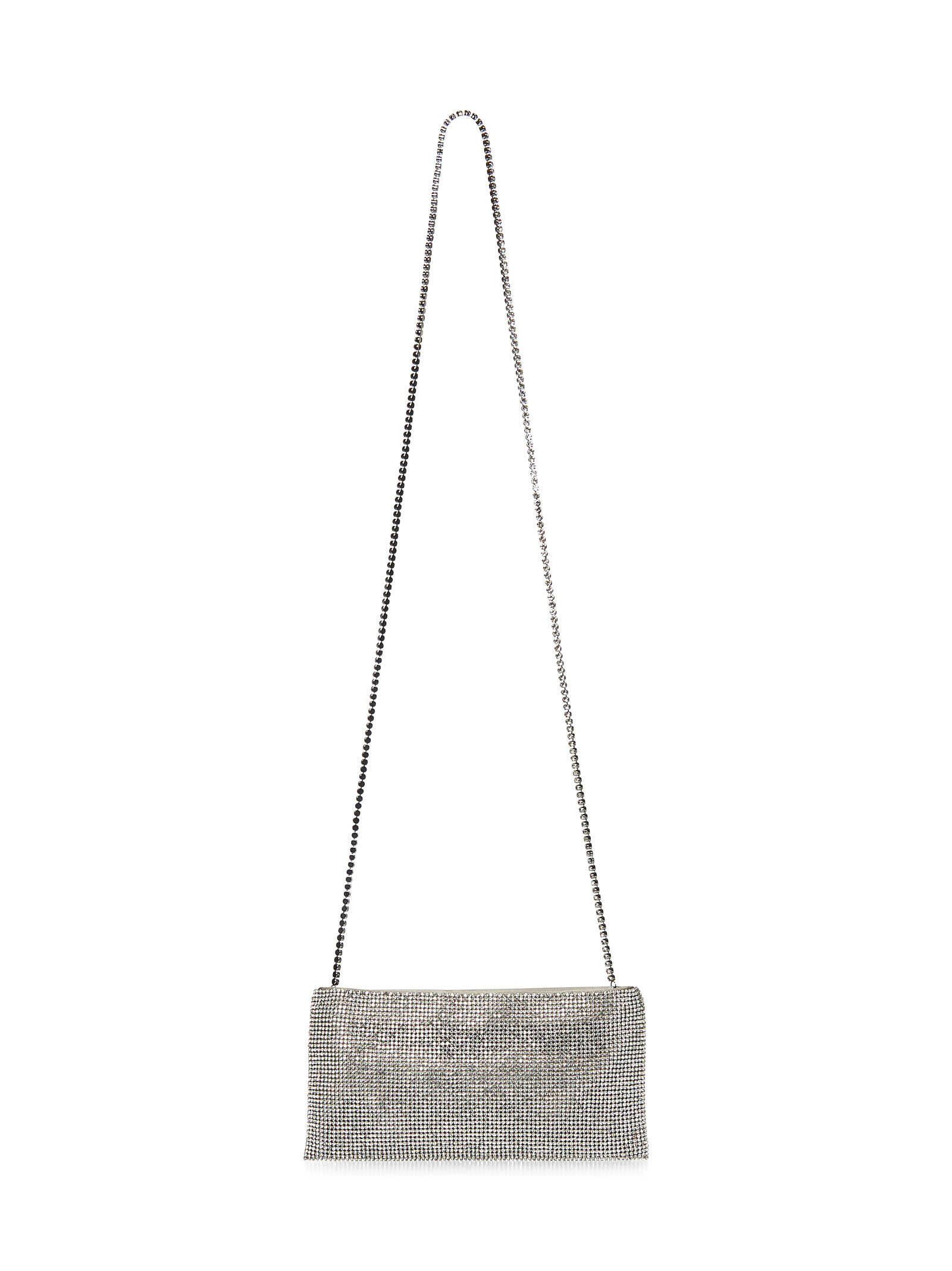 Mini silver crystal mesh clutch with silk satin lining and crystal shoulder strap.