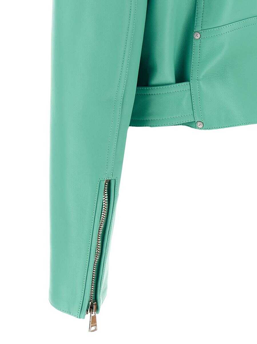 'Biker' leather biker jacket, zip closure, belt at the waist, pockets, long sleeves, logo buttons