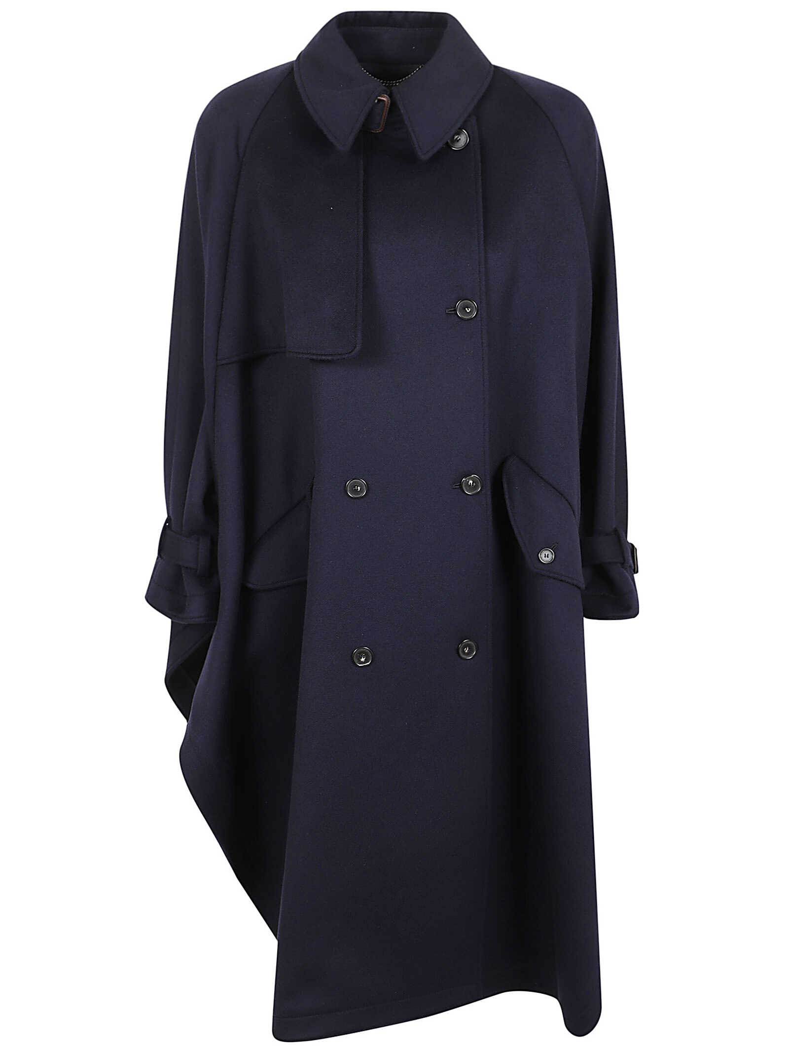 Elevate your style with this stunning blue trench coat by Stella McCartney. Crafted from certified wool gabardine, it features a polo neck, shoulder pads, and a relaxed silhouette. Perfect for adding a touch of sophistication to any outfit. Get yours now!