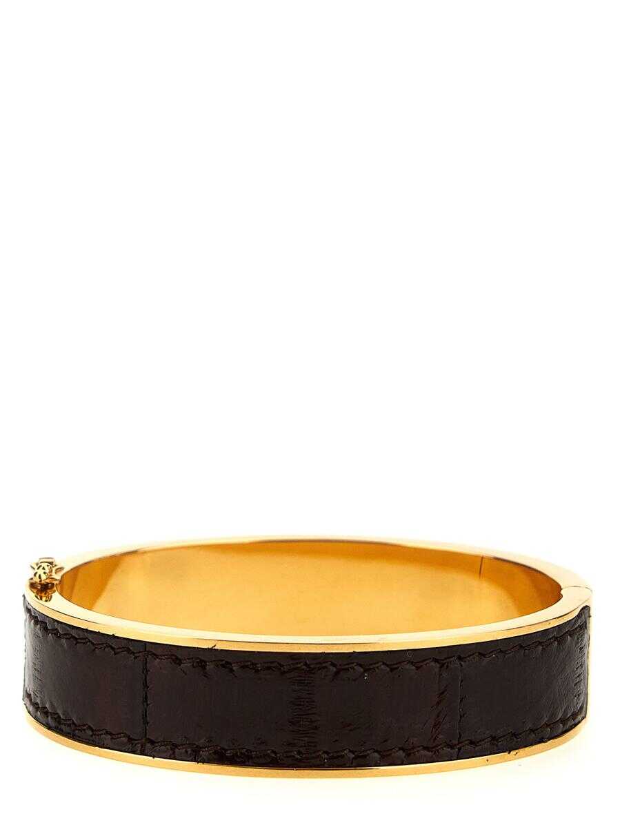 Gold metal 'YSL' bracelet with crocodile print leather details and a metal logo