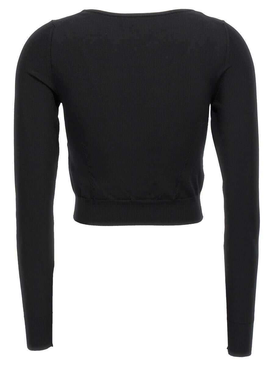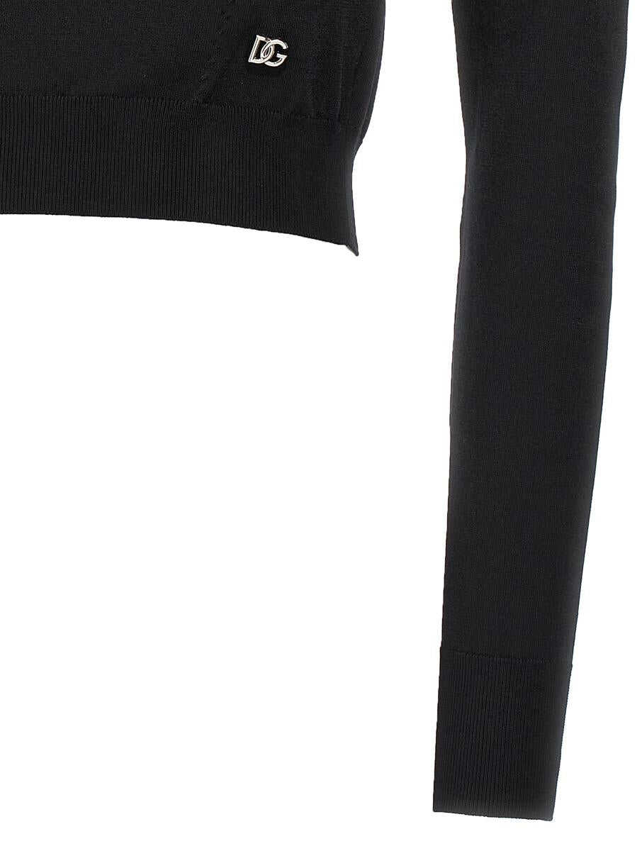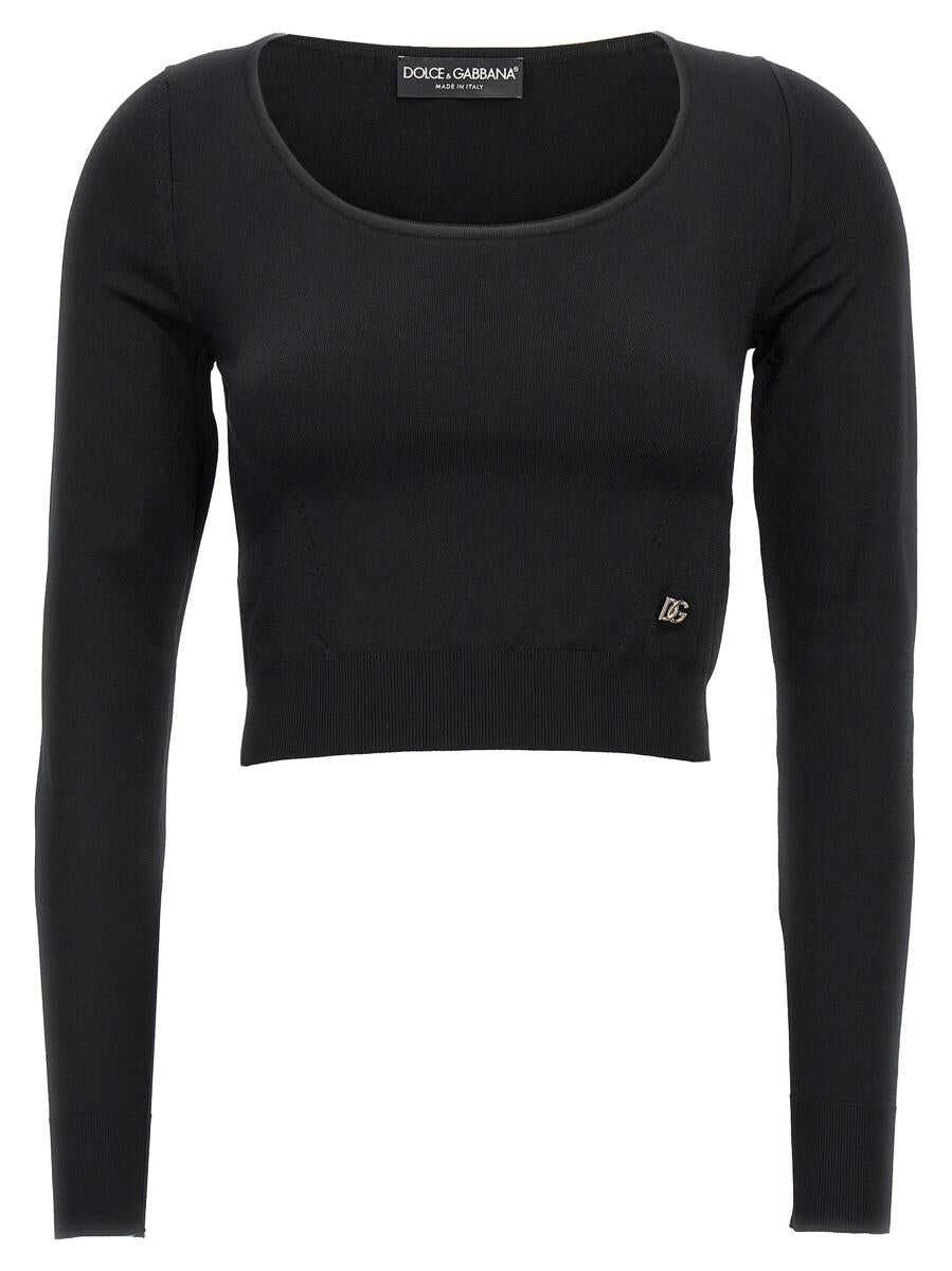 Viscose blend cropped sweater with metal logo application, round neckline, long cuffed sleeves