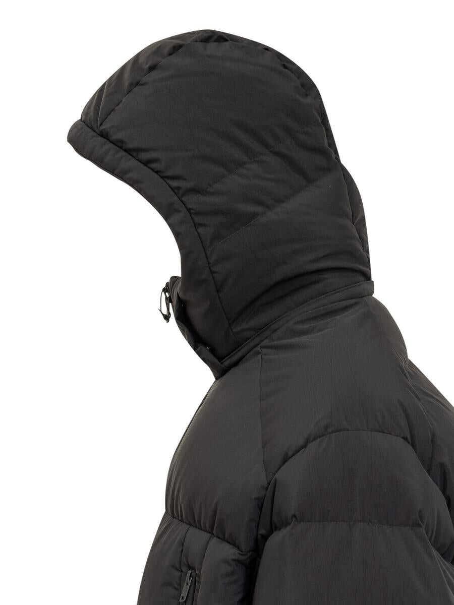 Hooded down jacket with high collar. Zipper closure. Elasticized cuffs. Two side pockets.