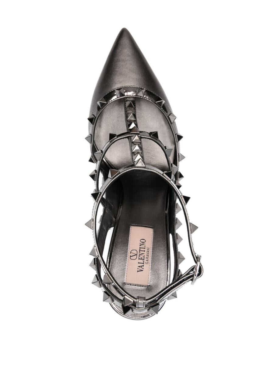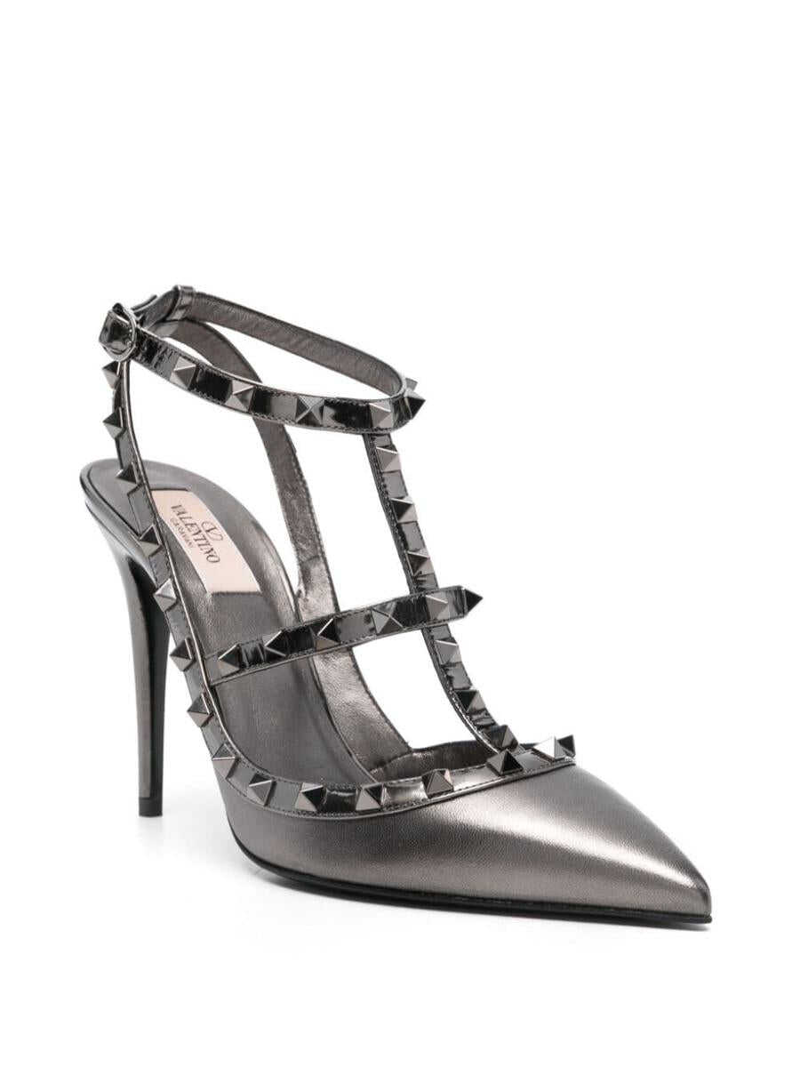 anthracite grey calf leather silver-tone Rockstud embellishment 100mm high stiletto heel buckle-fastening ankle strap slingback strap pointed toe branded footbed leather outsole Heel 3,9 in / 10 cm