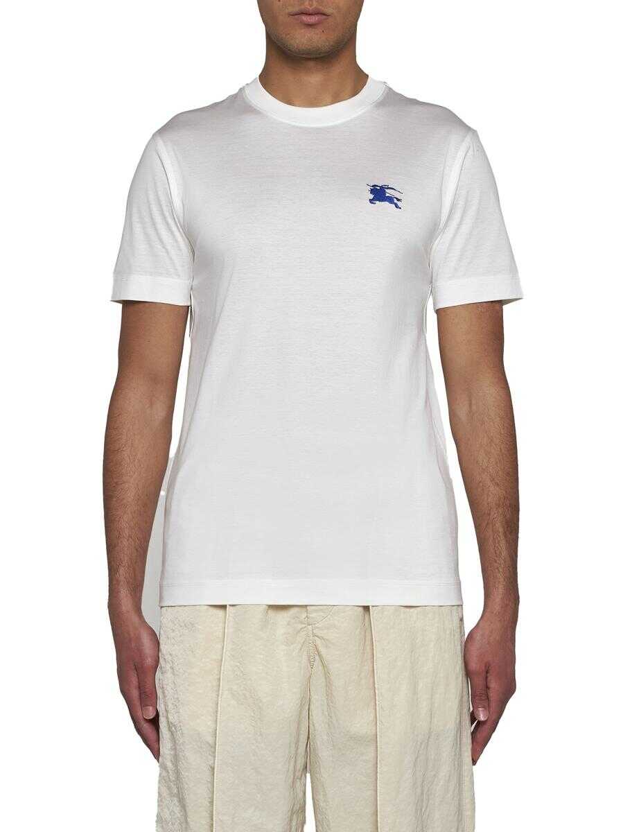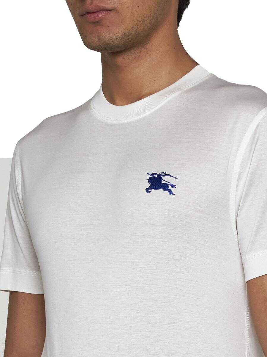 Burberry's white cotton t-shirt featuring a crew neck and blue Equestrian Knight logo embroidered on the chest. Size Type: International
