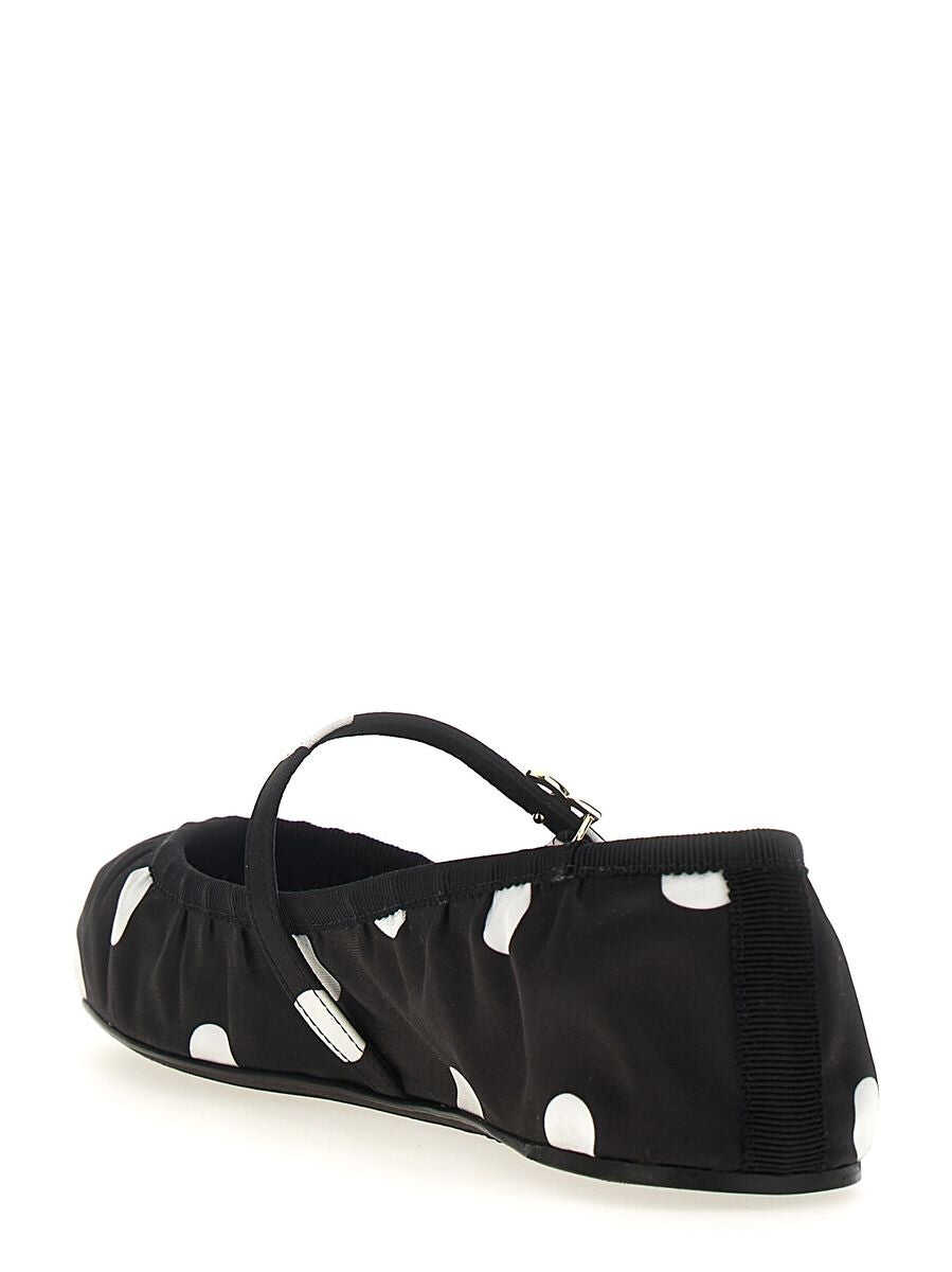 Black, leather, polka dot print, buckle-strap fastening, flat sole.