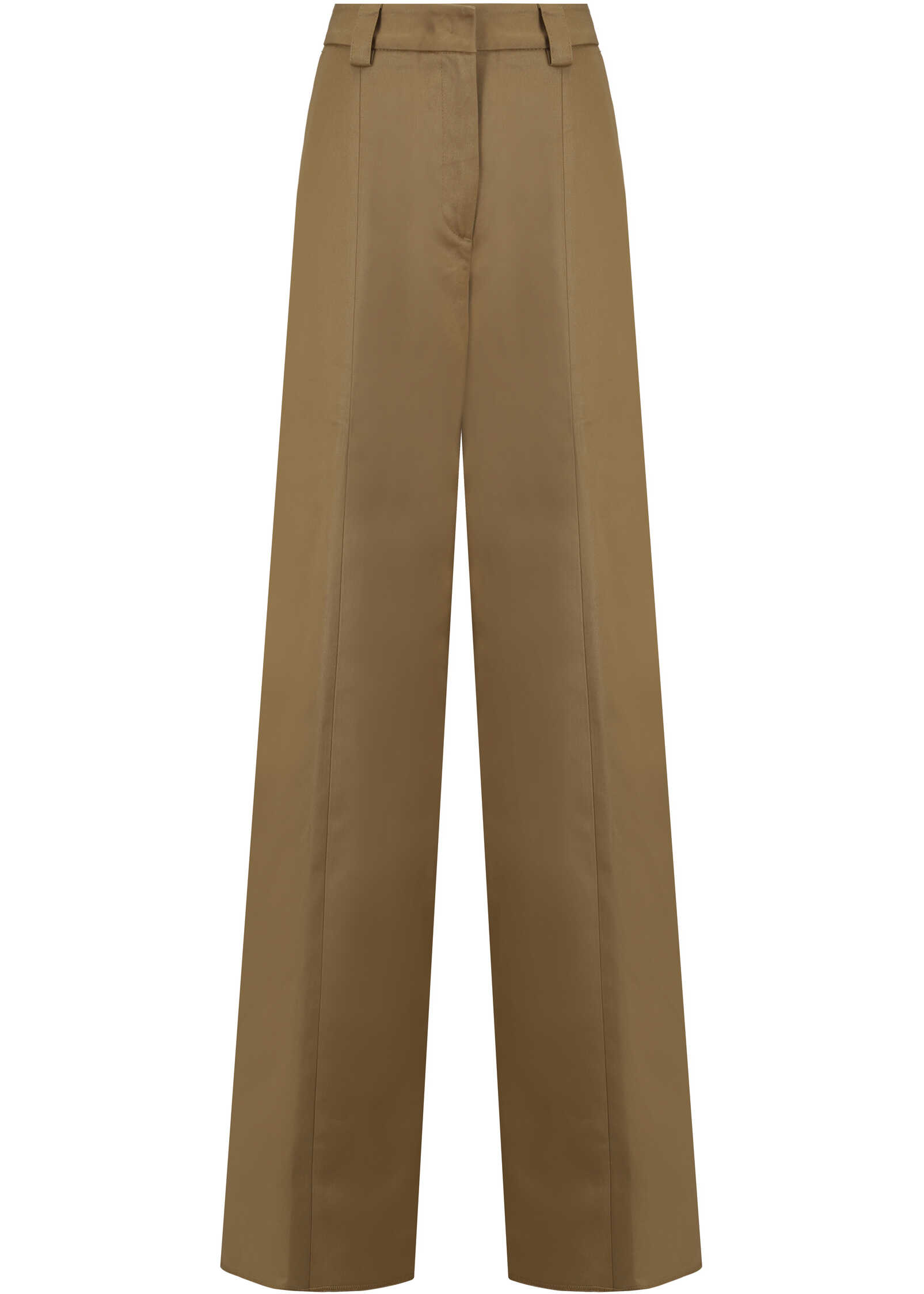Cotton Alma Pants by The Latest, wide-leg pattern, front button and zipper closure, two side slash pockets, two welt pockets on back, belt loops waistband, monochrome pattern.