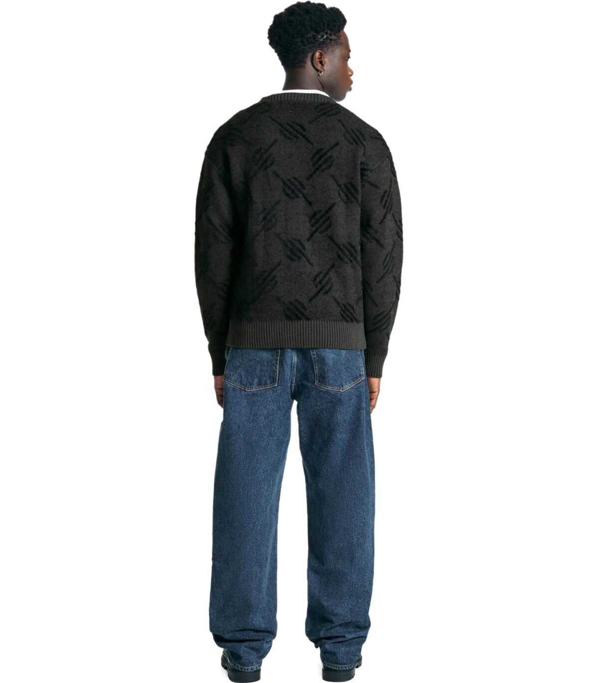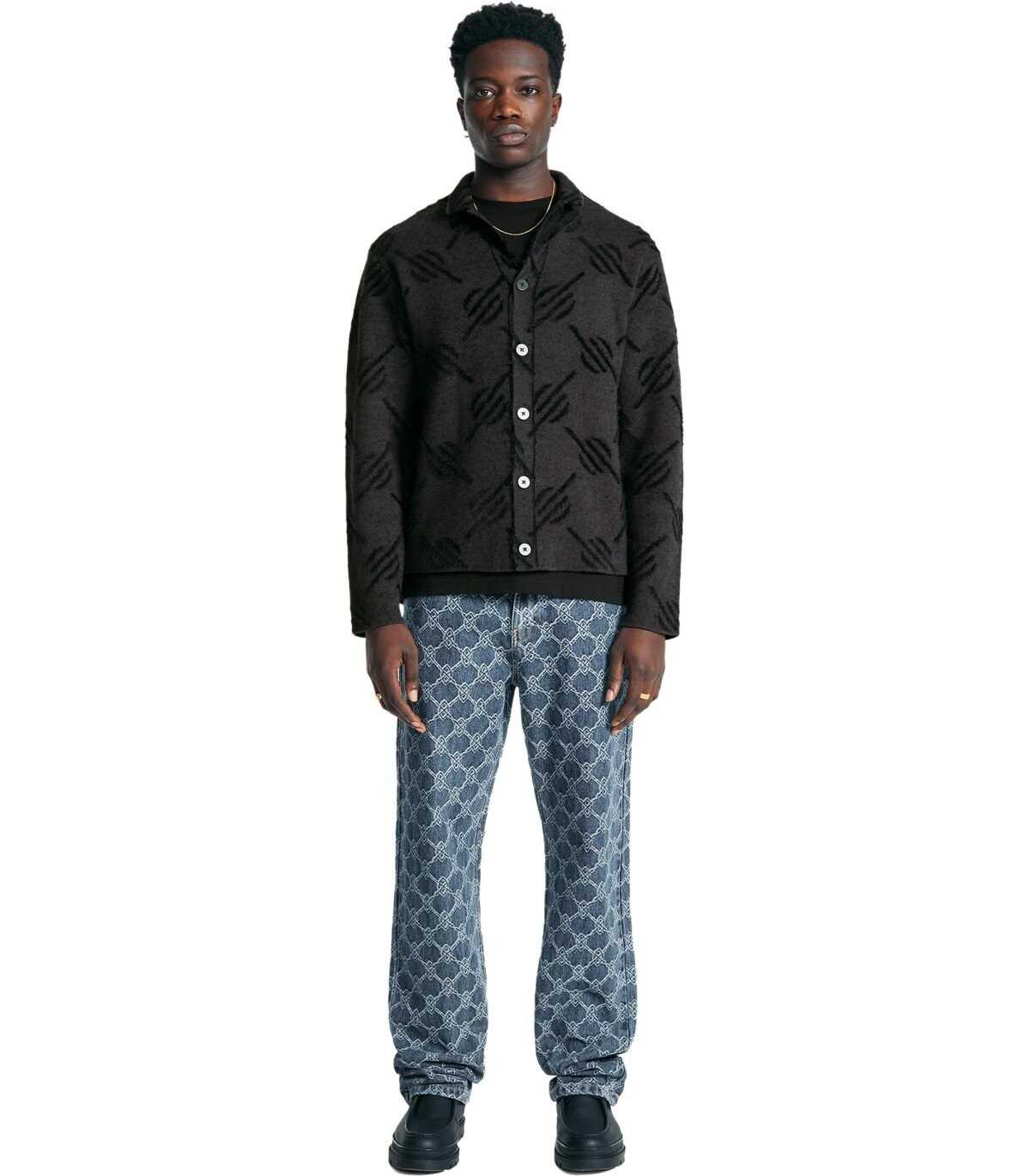 Kirabo Monogram cardigan by Daily Paper made of cotton, featuring a monogram pattern in shades of black and gray. Characterized by long sleeves with ribbed cuffs, it has a front closure with black buttons. Equipped with a pointed collar in a polo style, it has a ribbed front hem. Regular fit.