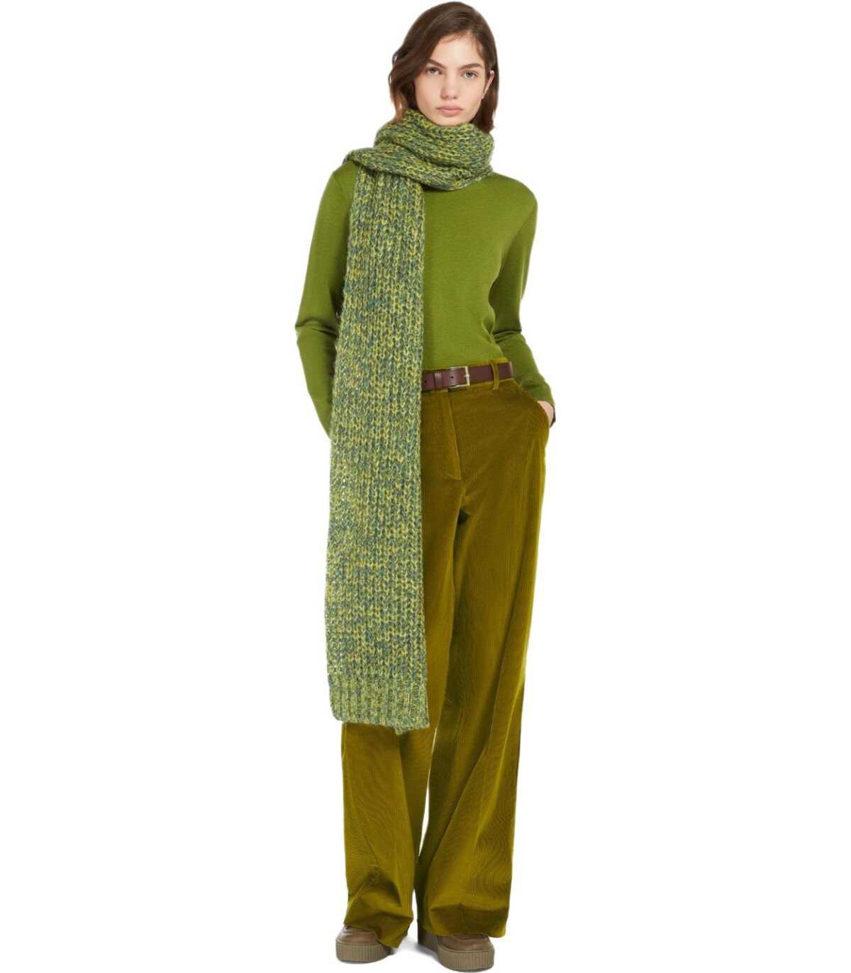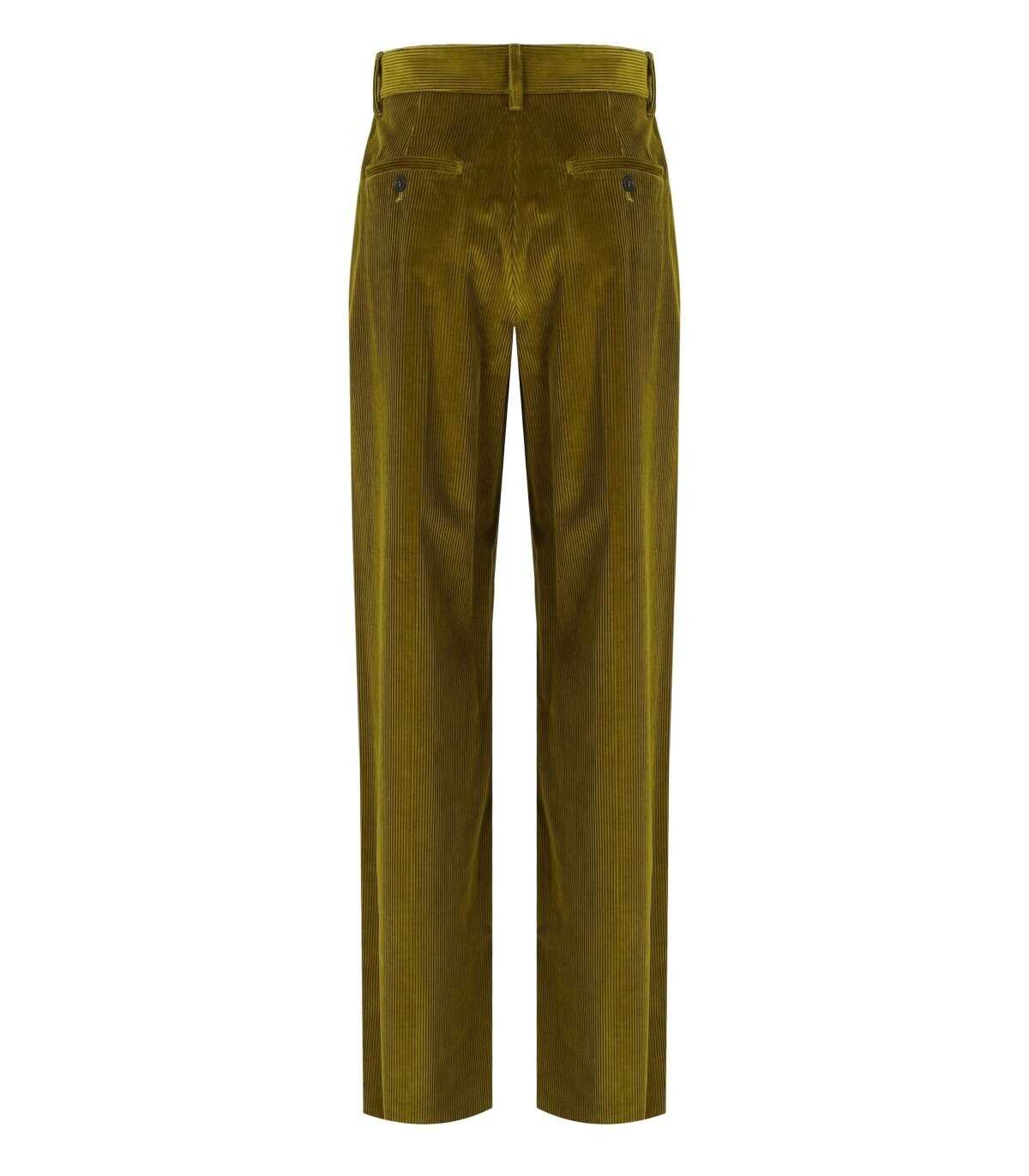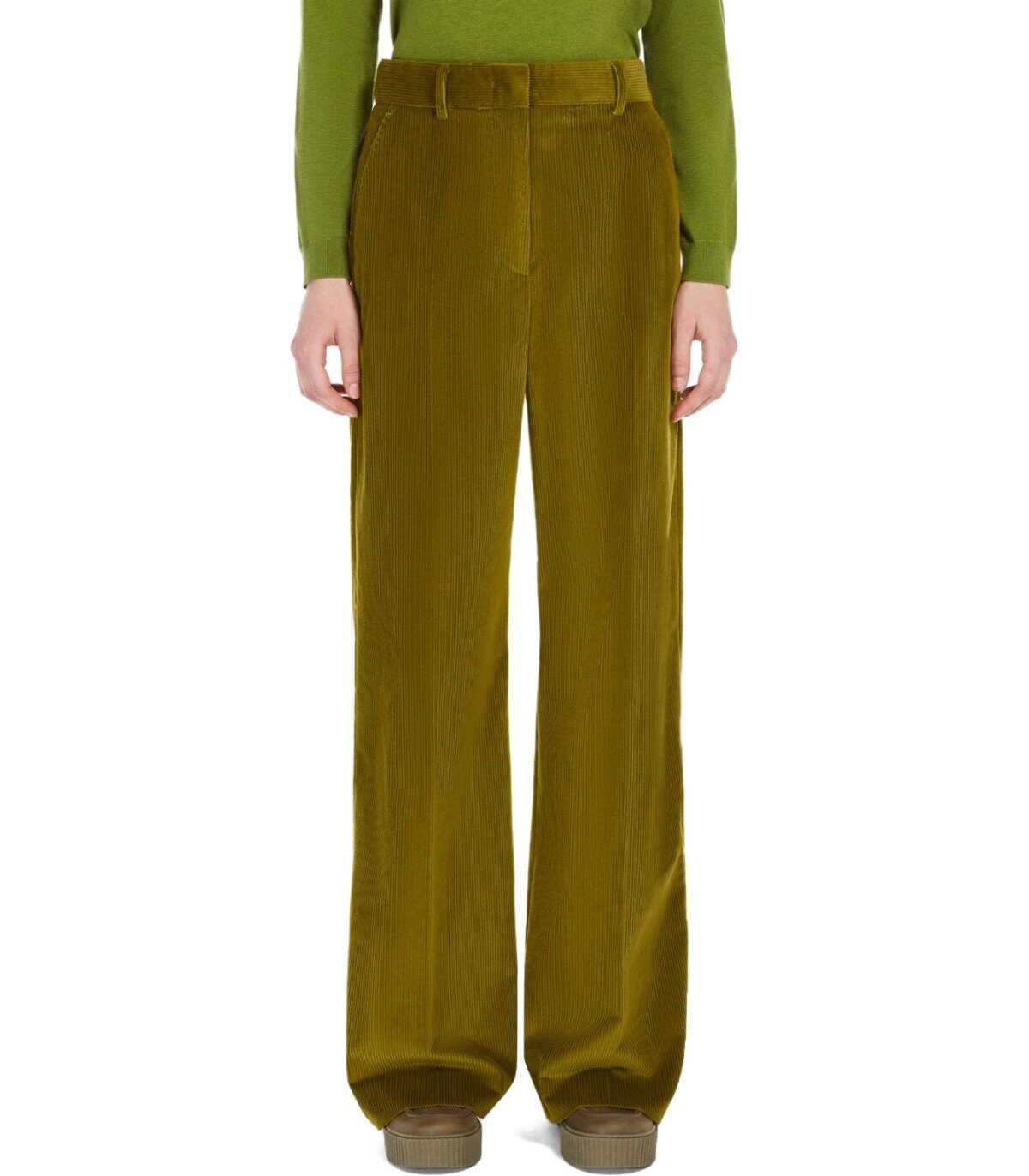 Max Mara Weekend Wide Leg trousers made of pure cotton velvet in green. Characterized by a striped pattern, it features a wide-leg silhouette. Closure with a high waistband, adorned with a zip and hook flap. French pockets on the sides. Welt pockets with button on the back. Loose fit.
