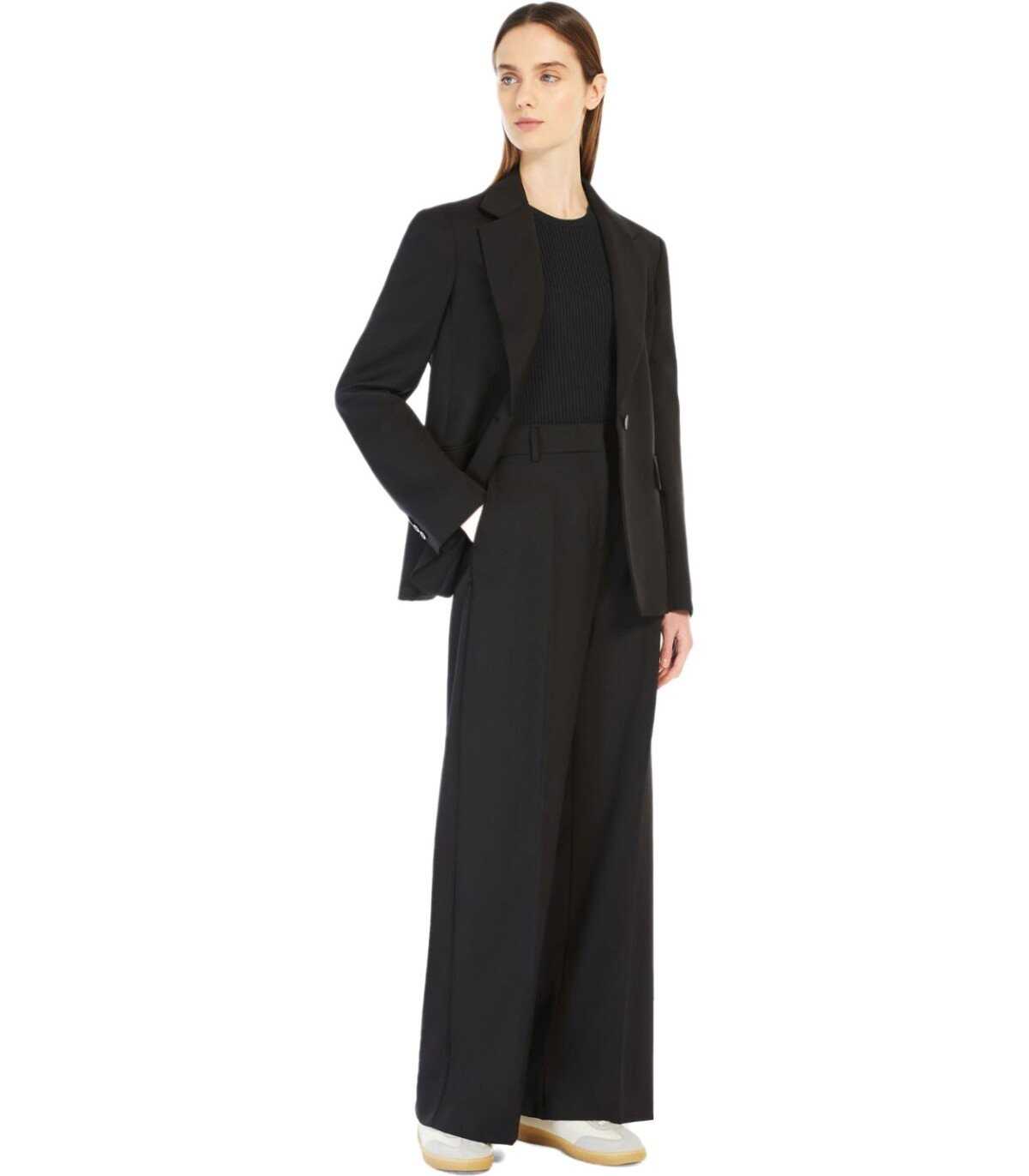 Max Mara Weekend palazzo trousers made of high-quality stretch wool fabric in black. Characterized by a high waistband closure, it features a zip with a flap and a hook. Equipped with French pockets on the sides and welt pockets on the back with a button. Wide leg with a pressed crease pattern. Generous fit, relaxed fit.