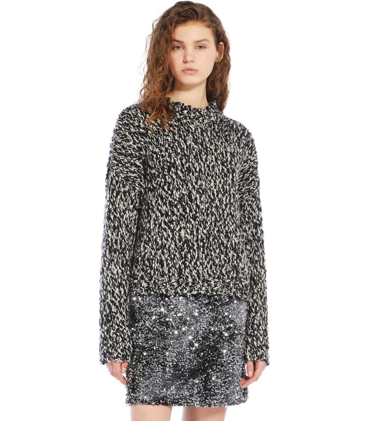 Max Mara Weekend Crine jumper made from high-quality blended chiné wool yarn in black. It features a classic crew neck and has long sleeves with a dropped shoulder. Finished with ribbed edges. Regular fit.
