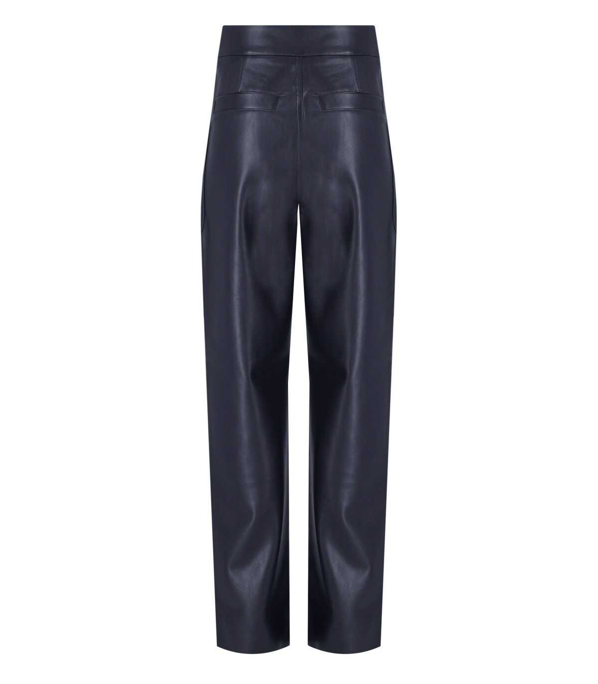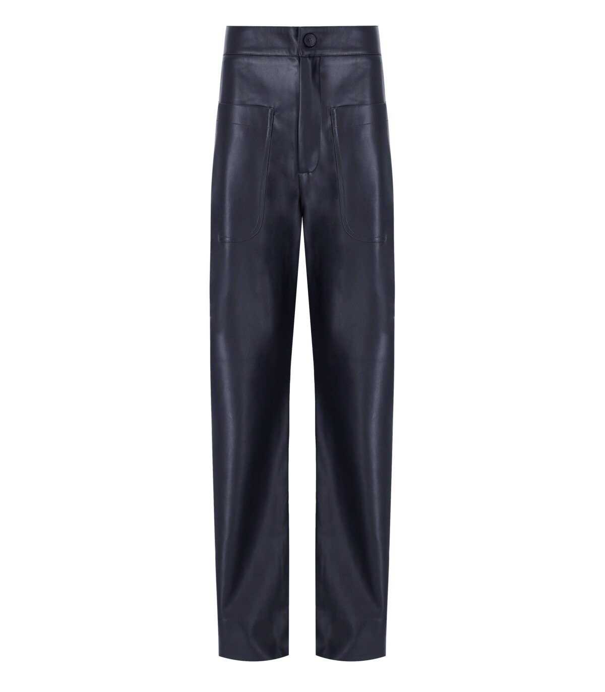 Cargo trousers Grate by Essentiel Antwerp made of soft faux leather in navy blue. Characterized by a zip closure with an elastic waist, they are finished with a comfortable wide leg cut. The flat bottom model features slanted side pockets. Equipped with applied pockets on the back. Relaxed fit.