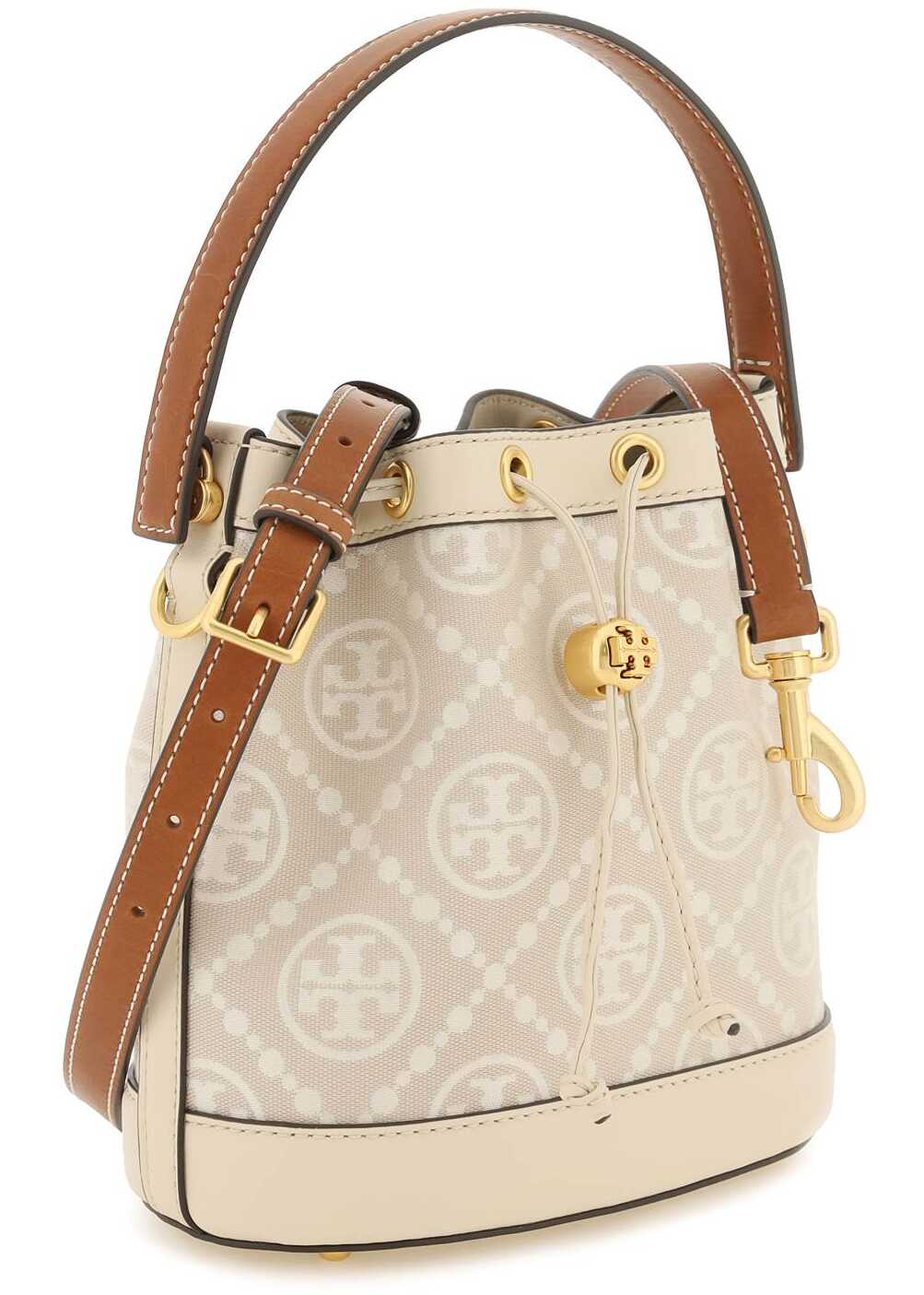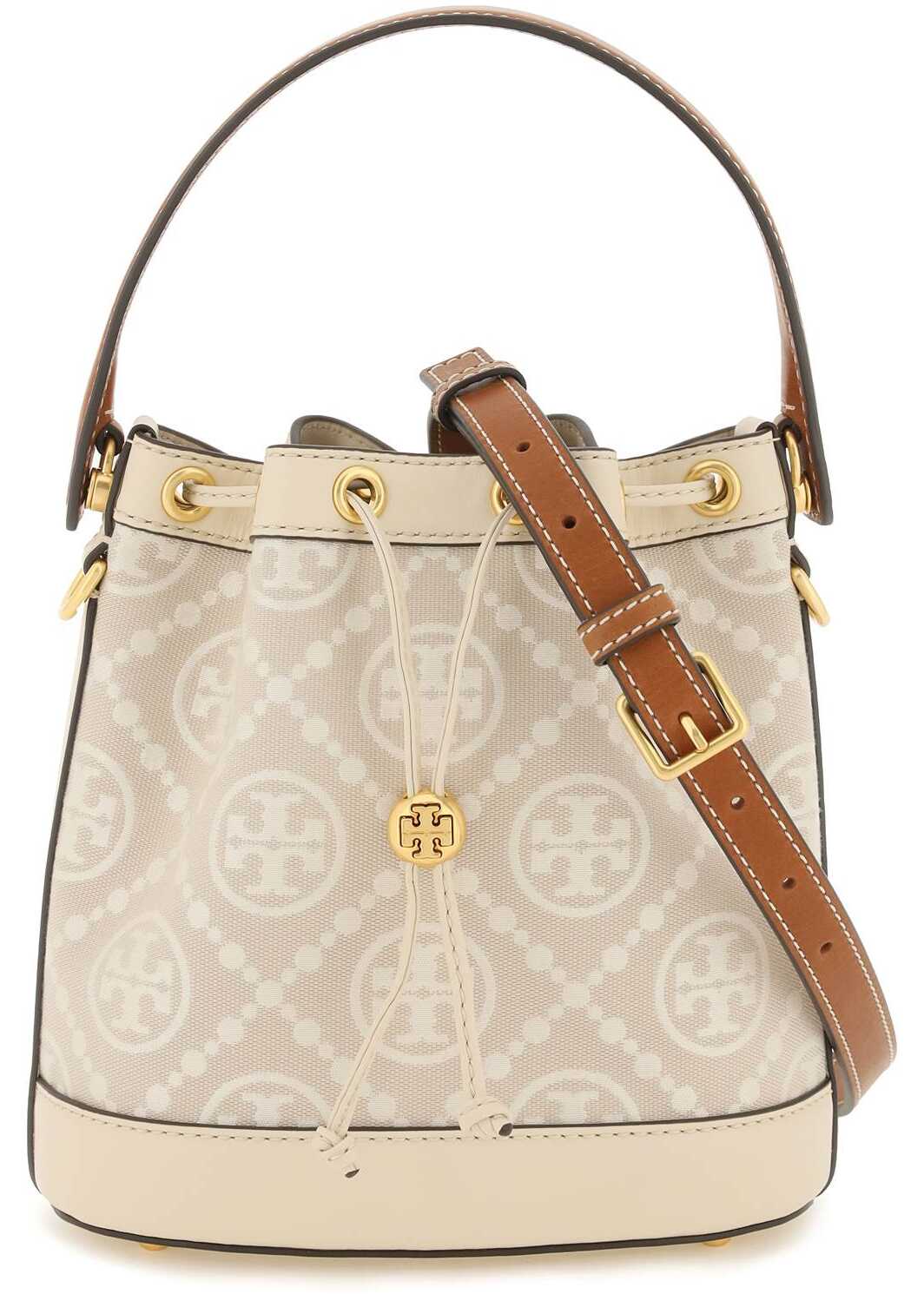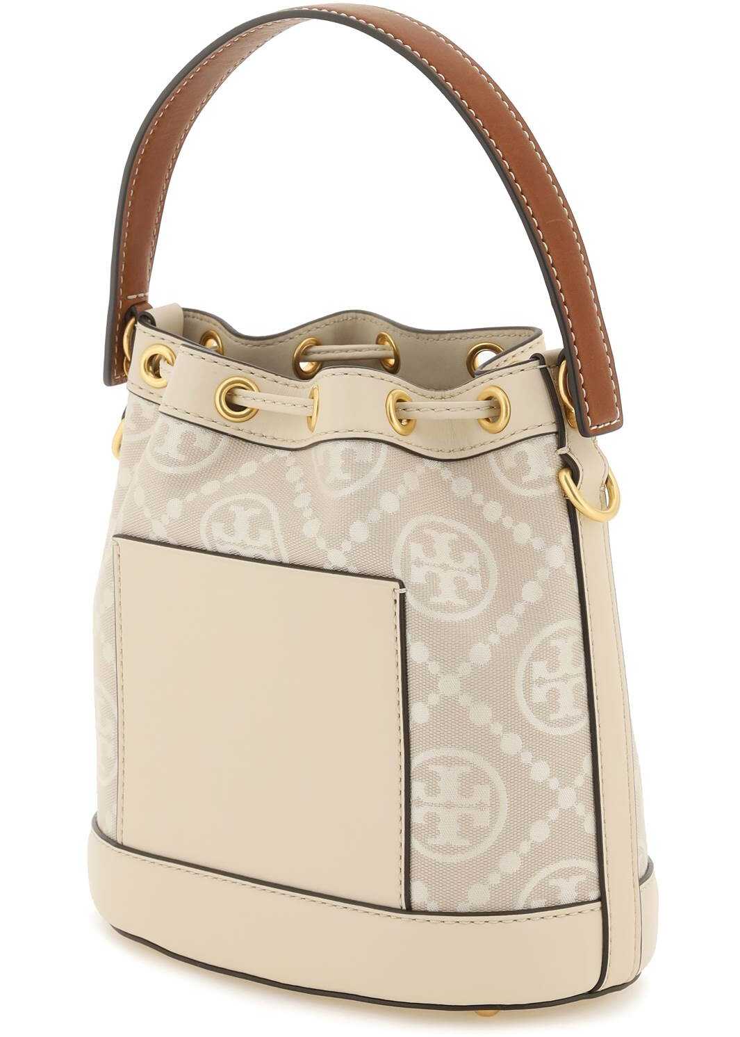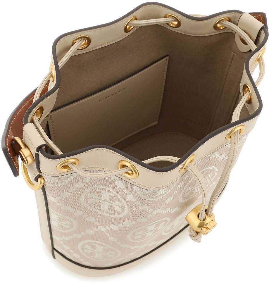 Tory Burch "T Monogram" bucket bag made of jacquard fabric with leather and tone-on-tone trims. Drawstring closure, suede interior with one open leather pocket, single handle, adjustable and detachable shoulder strap and protective studs. Gold-finished metalware.