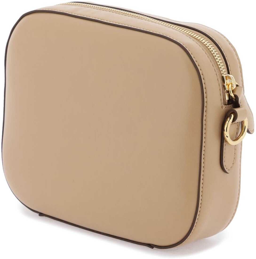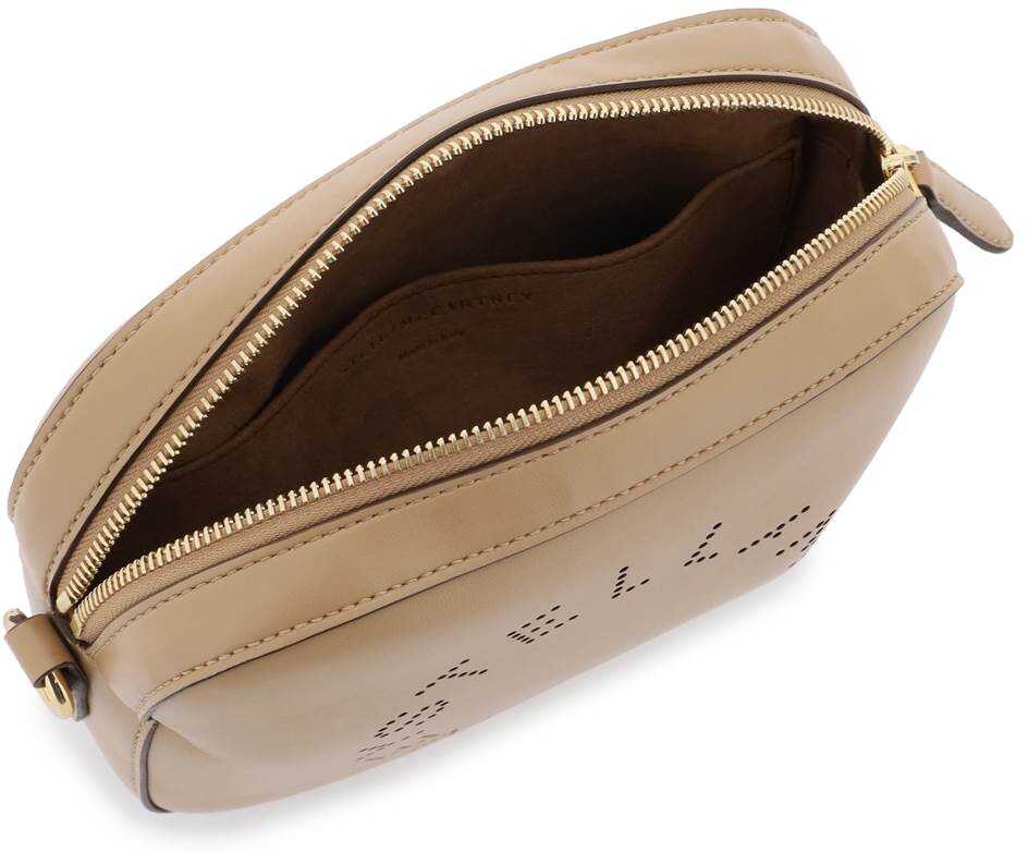 Stella McCartney camera bag in alter-nappa leather with the iconic perforated front Stella Logo. It features an adjustable and removable webbing strap in contrasting colour with maxi jacquard logo. Zip closure, faux suede leather lining, one inner slip pocket. Gold-tone metalware.