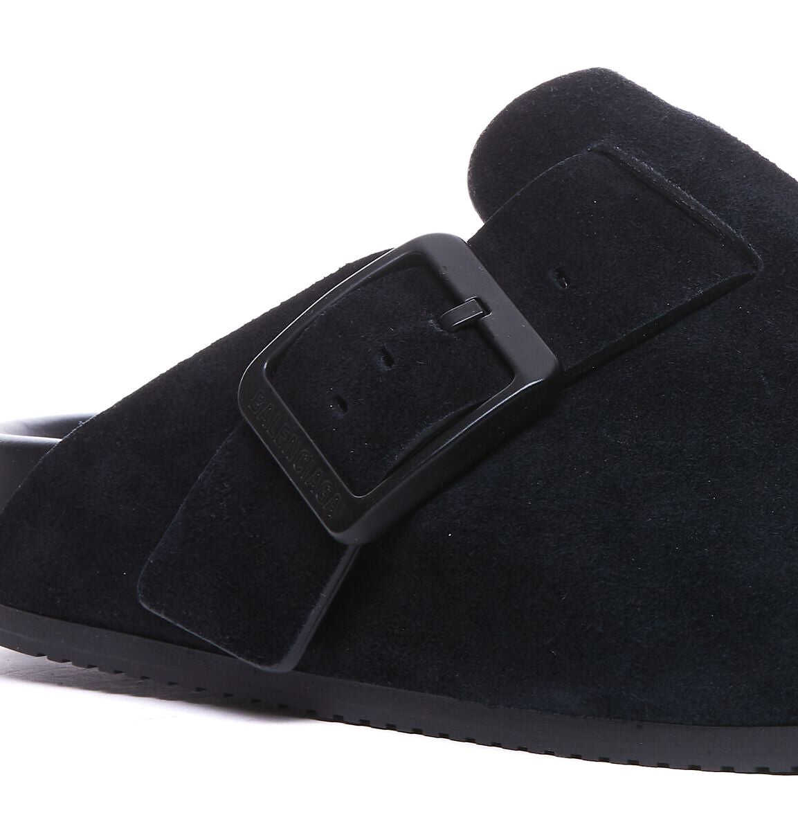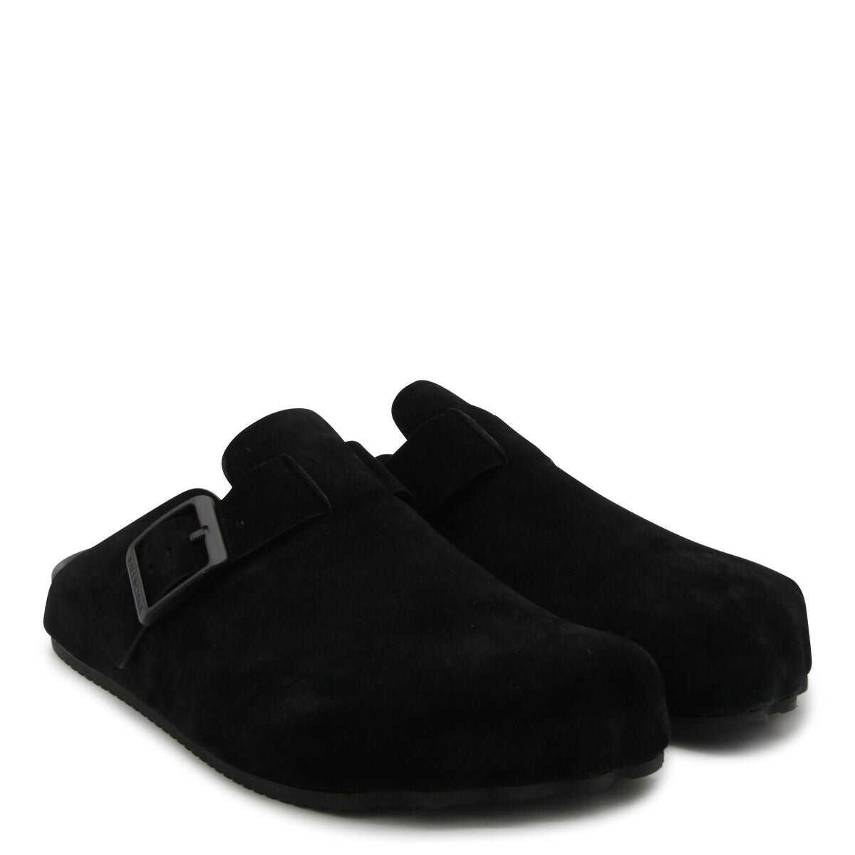 Balenciaga's flat mules crafted in black suede. Featuring five finger shaped silhouette, adjustable strap with logoed metal buckle, leather lining and rubber sole.