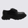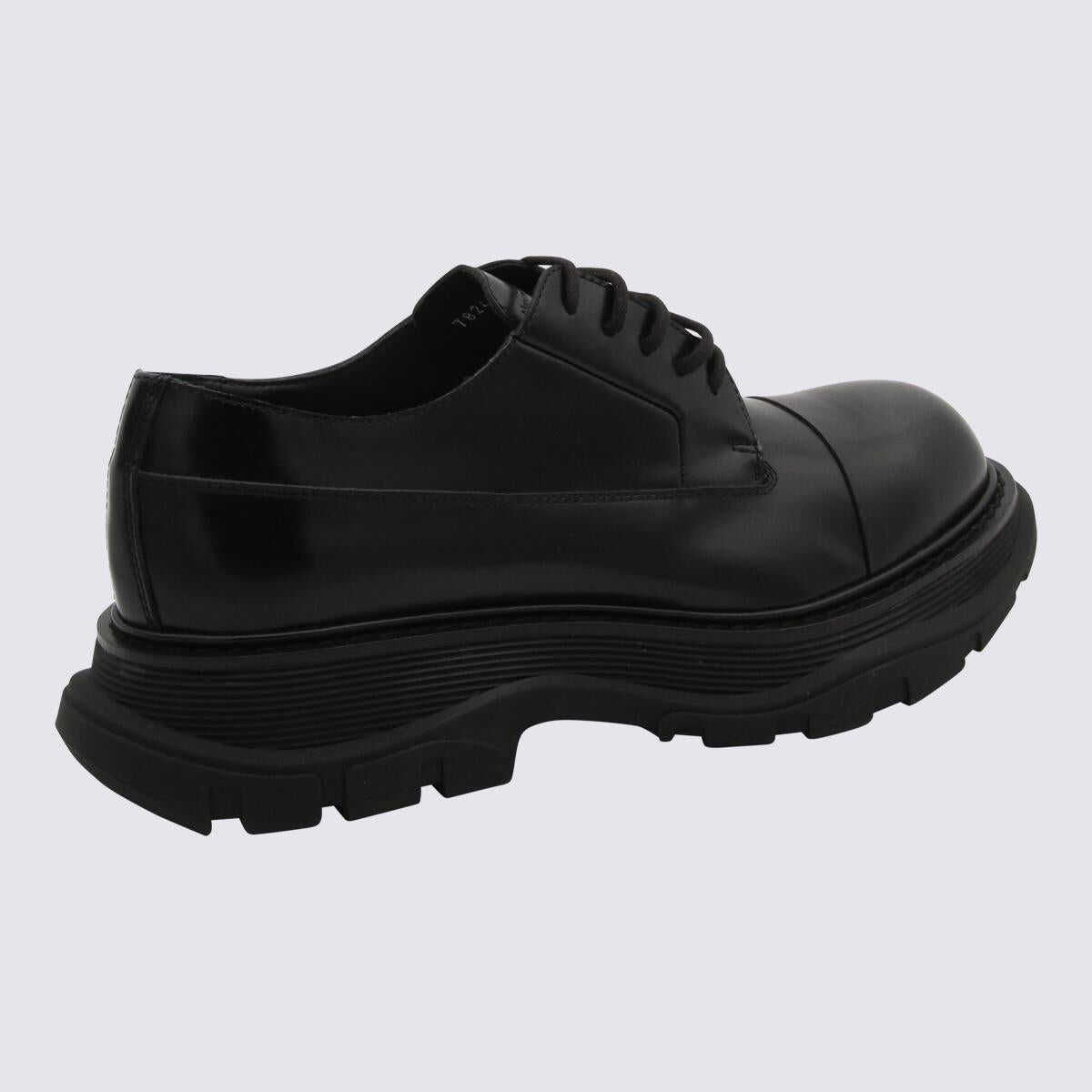 Black leather Tread derby shoes from Alexander McQueen featuring polished finish, logo-debossed tongue, front lace-up fastening, round toe, branded insole and oversize rubber sole.