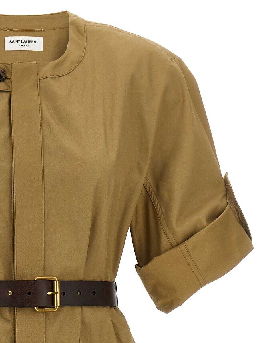 Twill midi dress, crew neck, front button closure, patch pockets, slightly padded shoulders, adjustable sleeve with strap and button