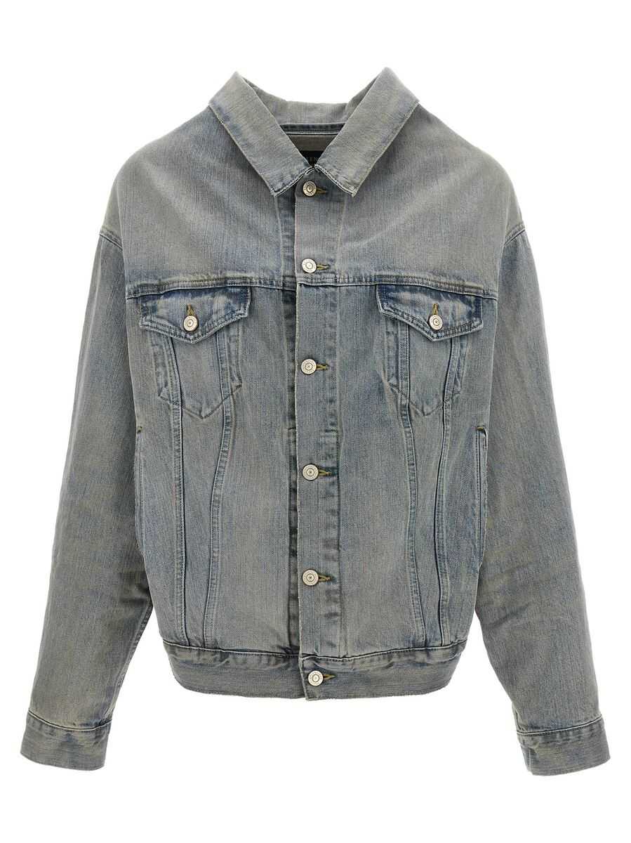 Off-the-shoulder denim jacket in selvedge organic cotton with button closure, pockets, long cuffed sleeves.