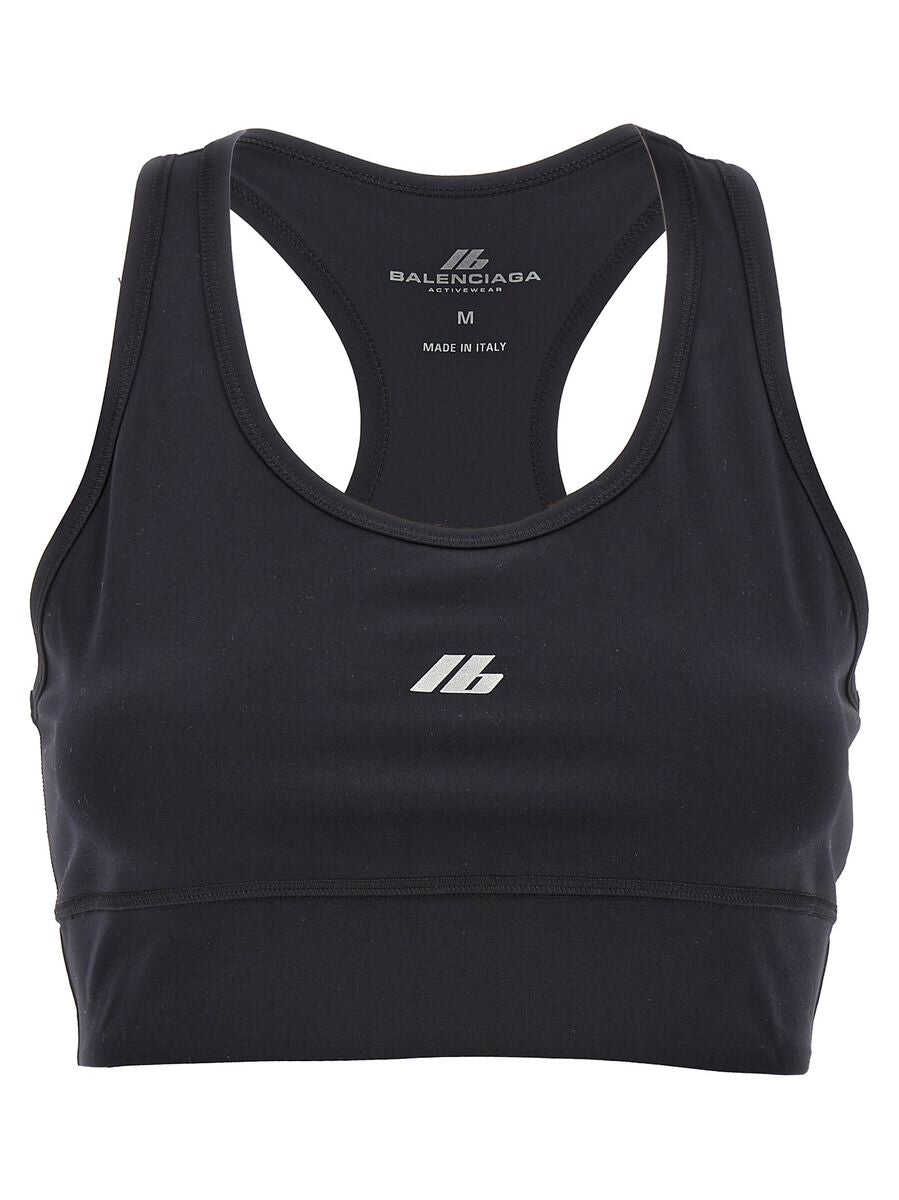 Balenciaga's sports bra crafted in black stretch jersey with reflective logo print at chest. It features round neckline, racer back and straight hem.