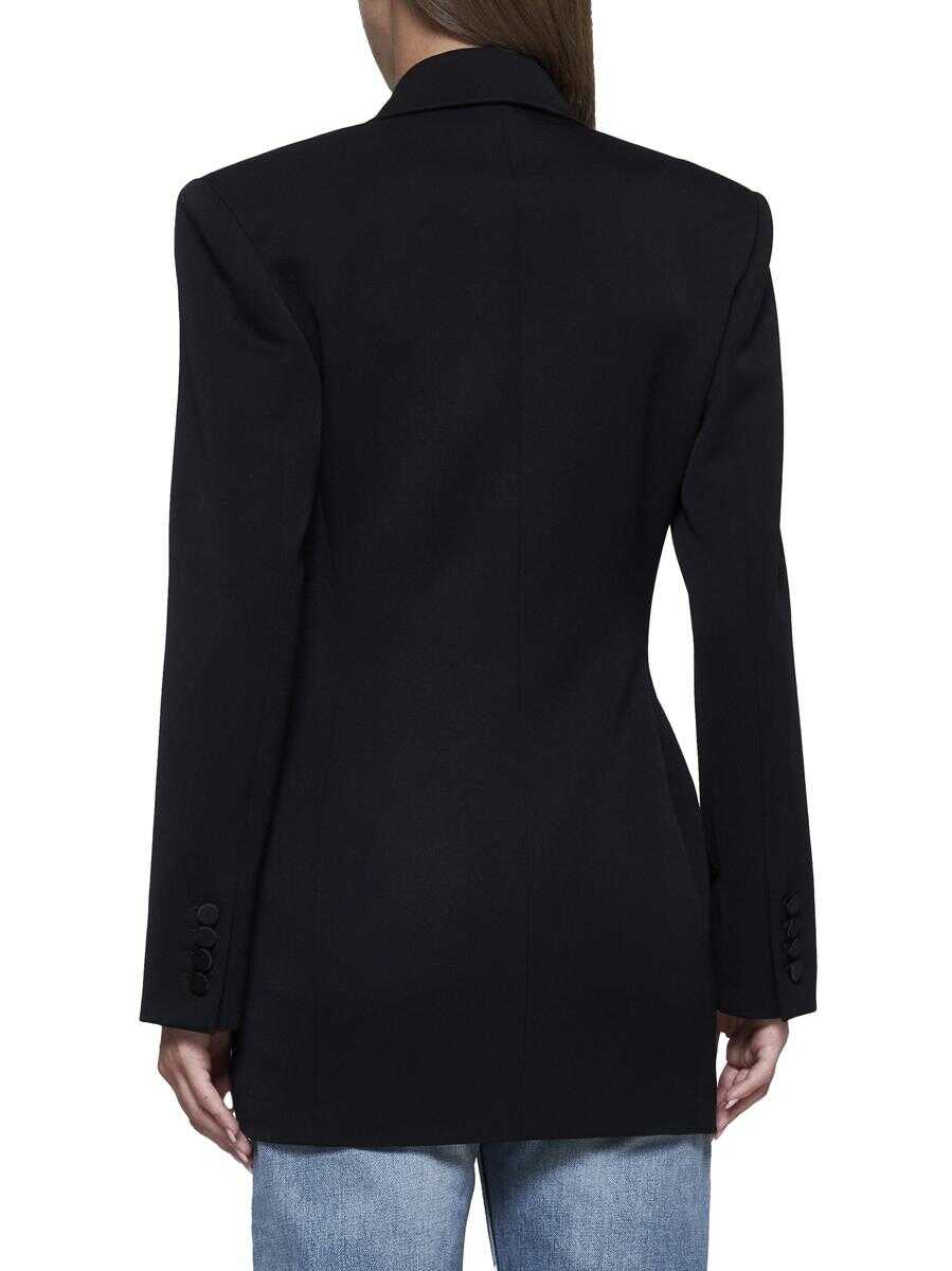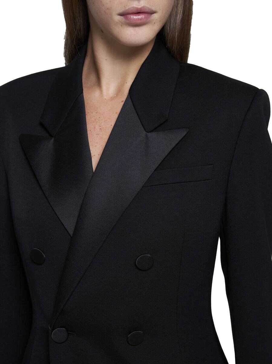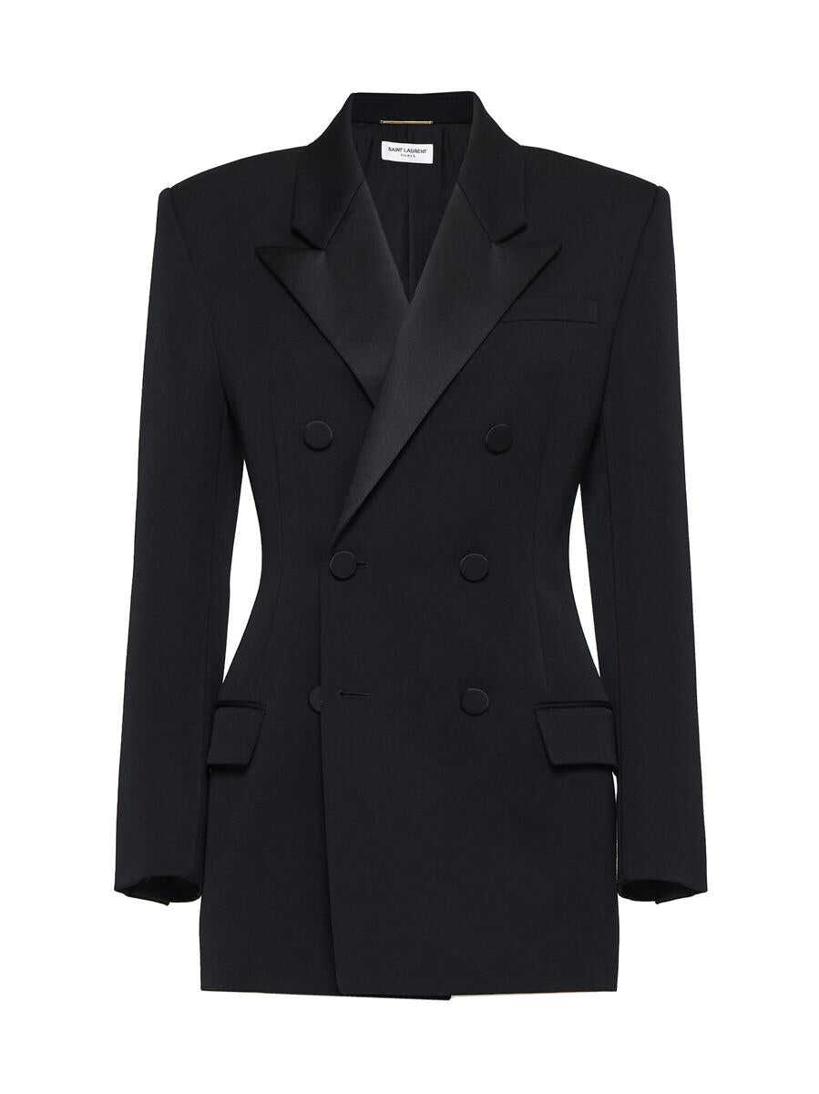Saint Laurent's black wool double-breasted blazer featuring tone-on-tone satin peak lapels, chest pocket, satin-covered buttons, front flap pockets, internal pockets and shaped silhouette. Size Type: France Women