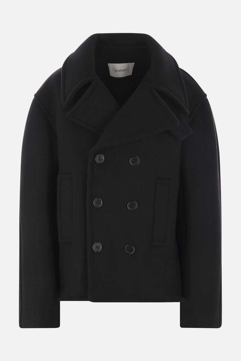 Saint Laurent's double-breasted oversized peacoat made of black wool cloth. It features wide lapels, front button closure, welt pockets, long sleeves, straight hem, and silk-lined interior.