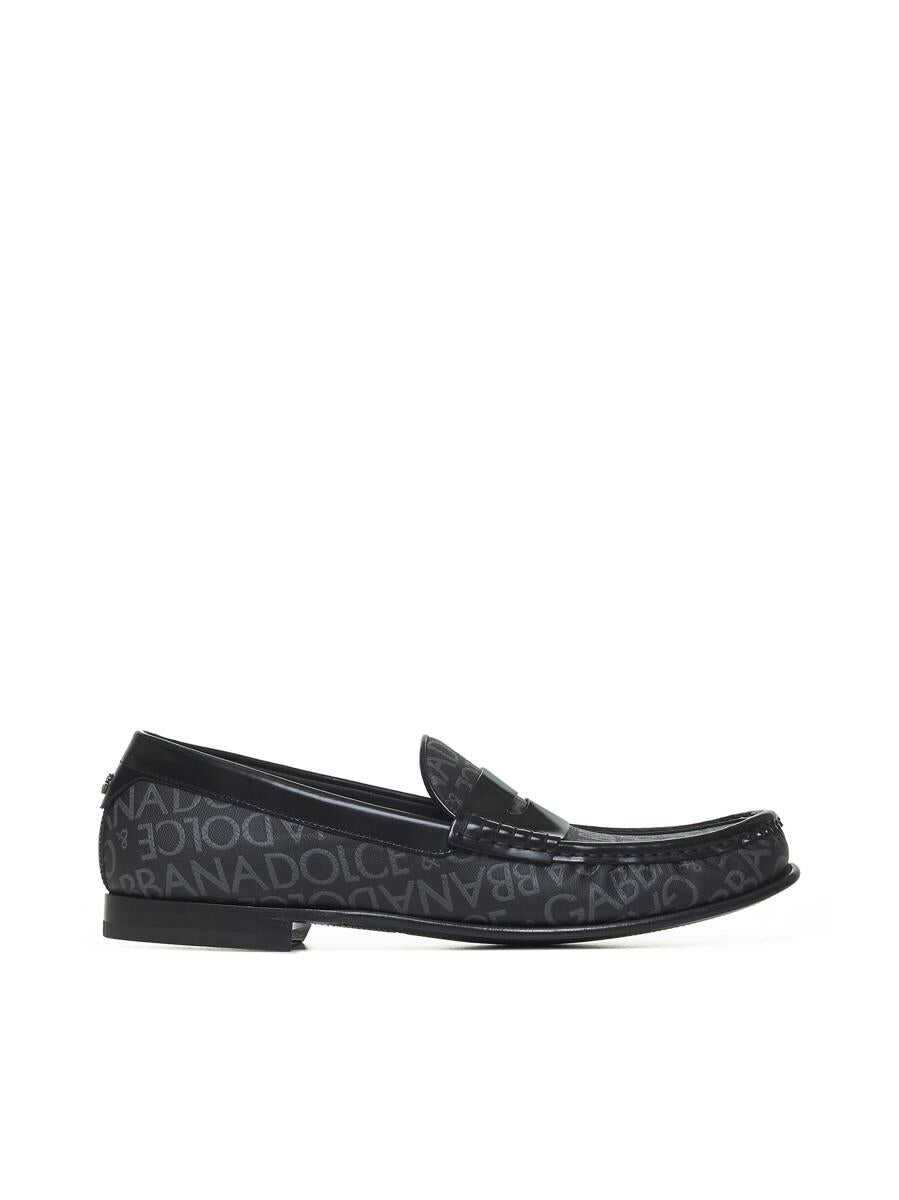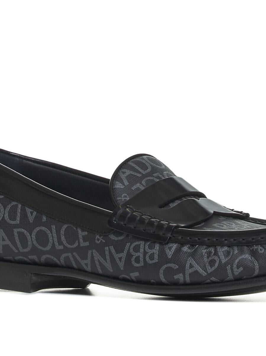 Dolce & Gabbana’s waxed fabric loafers featuring all-over logo in black and grey featuring black leather details, rounded toe, DG logo plaque on the back and leather sole.