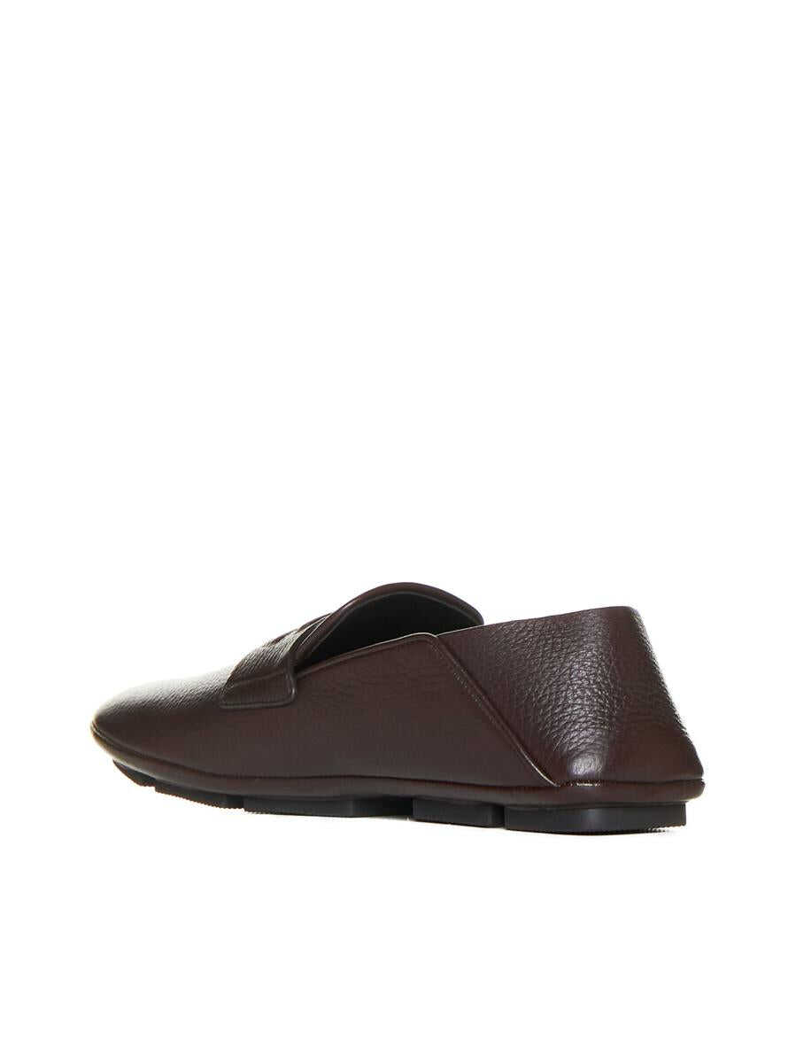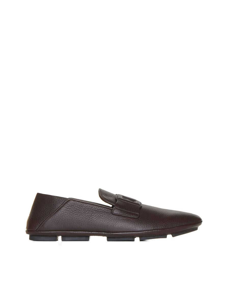Dolce & Gabbana’s dark brown leather loafers featuring a rounded almond toe, strap with DG logo, foldable back panel and flat rubber outsole.