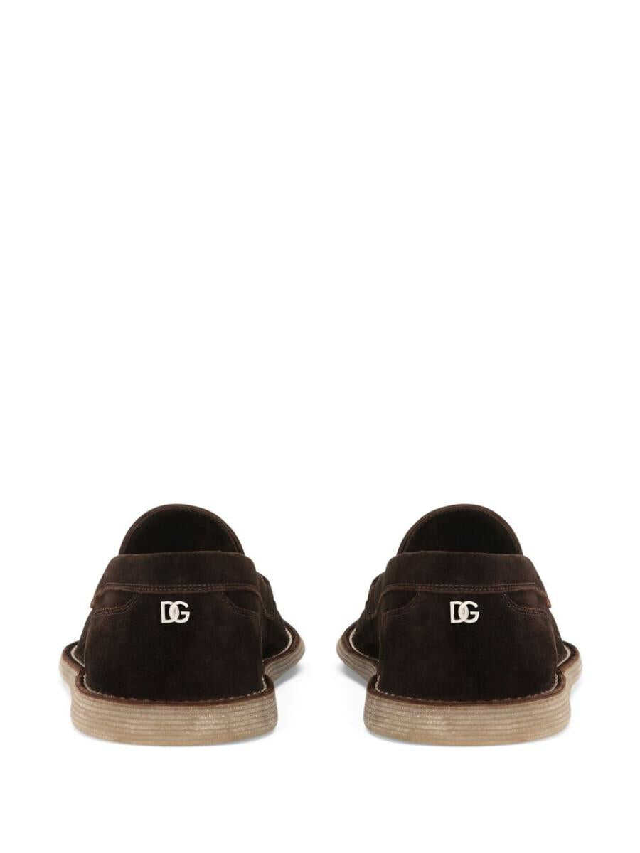brown calf suede logo plaque almond toe branded leather insole flat rubber sole