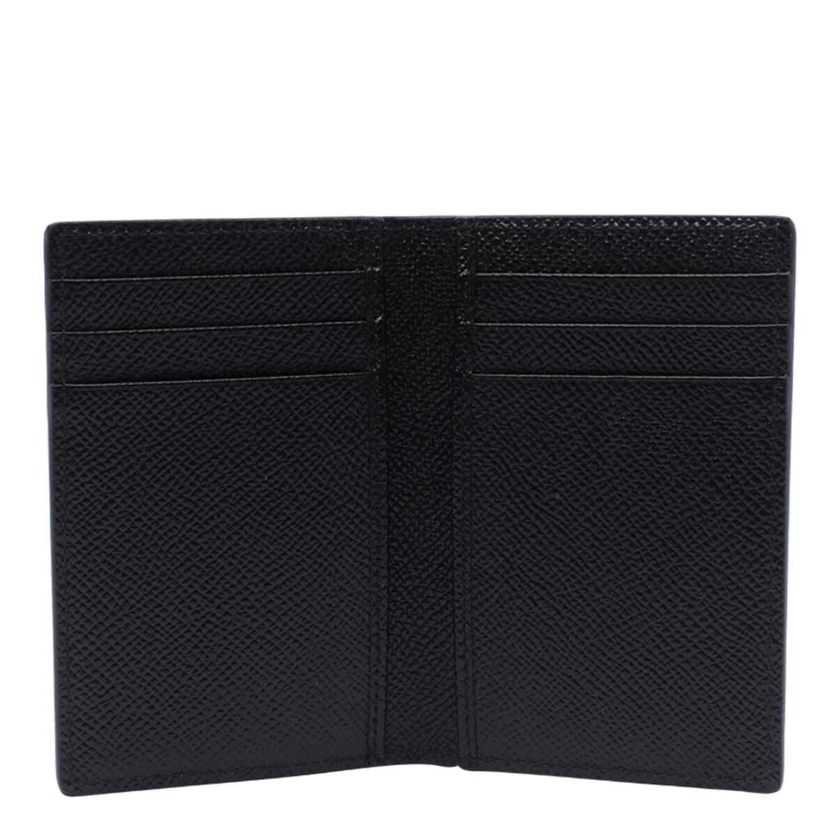 Dolce & Gabbana’s black Dauphine leather vertical card holder featuring logo plaque on the front, six card slots + double internal compartments.