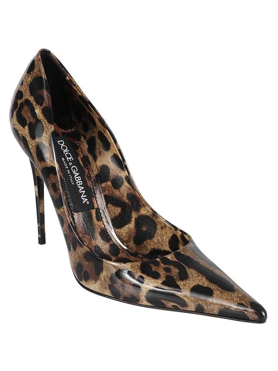 x Kim 110mm leopard-print pumps from DOLCE & GABBANA featuring animalier brown, calf leather, all-over leopard print, patent finish, gold-tone logo plaque, branded footbed, slip-on style, pointed toe and high stiletto heel.