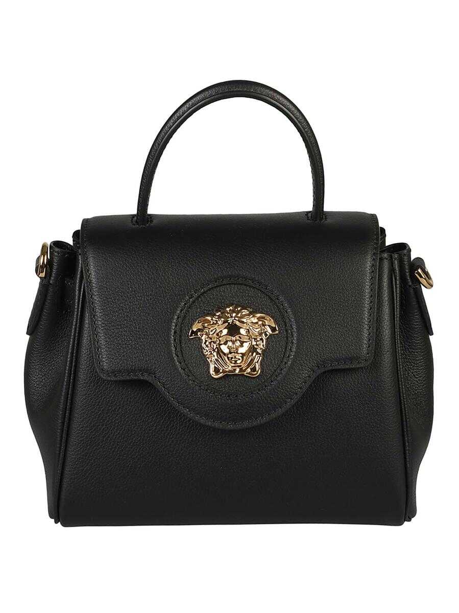 Black leather La Medusa top-handle tote from VERSACE featuring Medusa plaque detail, foldover top, single rounded top handle, internal slip pocket, gold-tone hardware and adjustable-length chain.