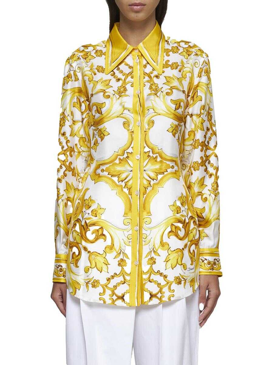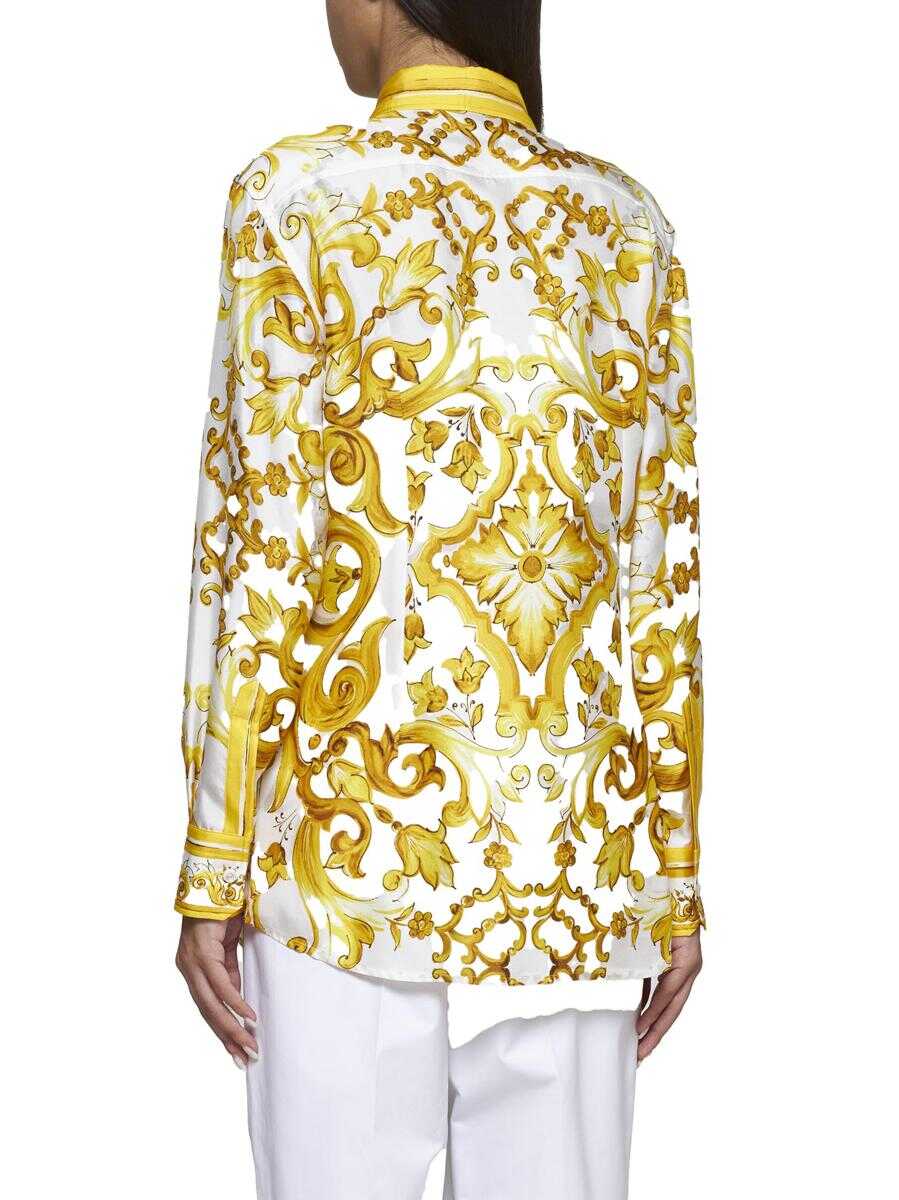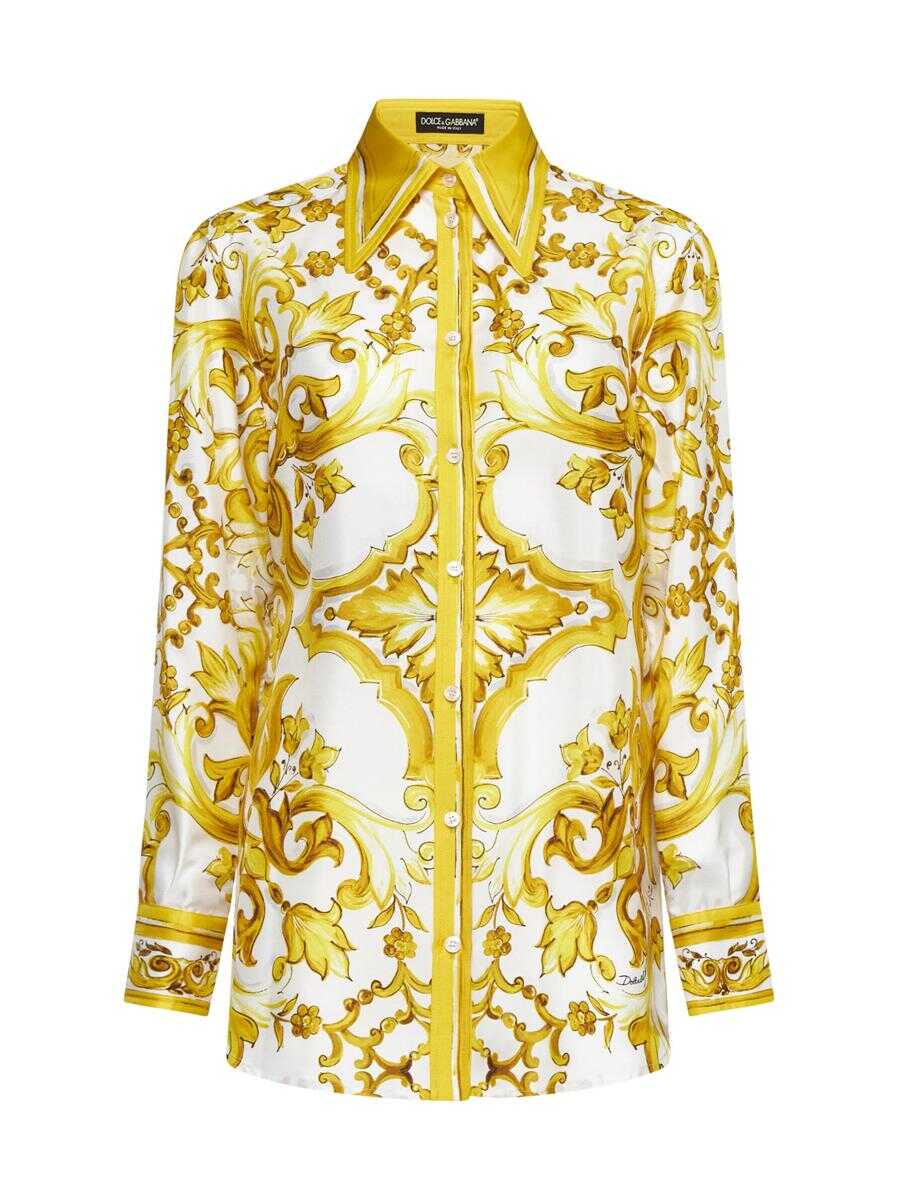 Dolce & Gabbana’s silk shirt featuring Majolica print in shades of yellow on a white background, pointed collar, buttoning at the front and cuffs and a rounded hem.